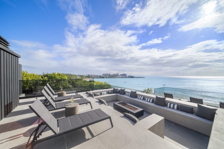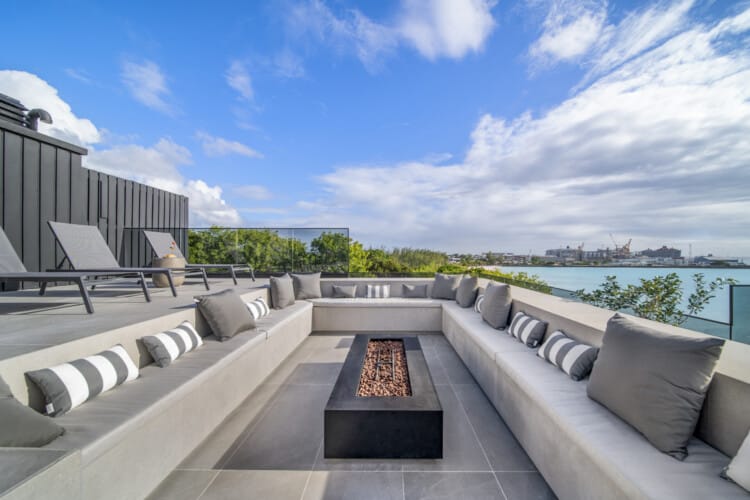 • A rooftop lounge with a pool, firepit, and panoramic sea views