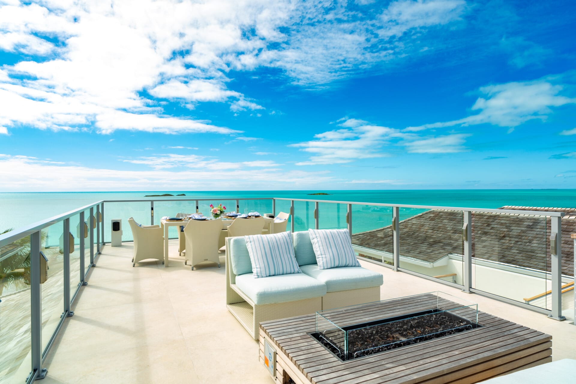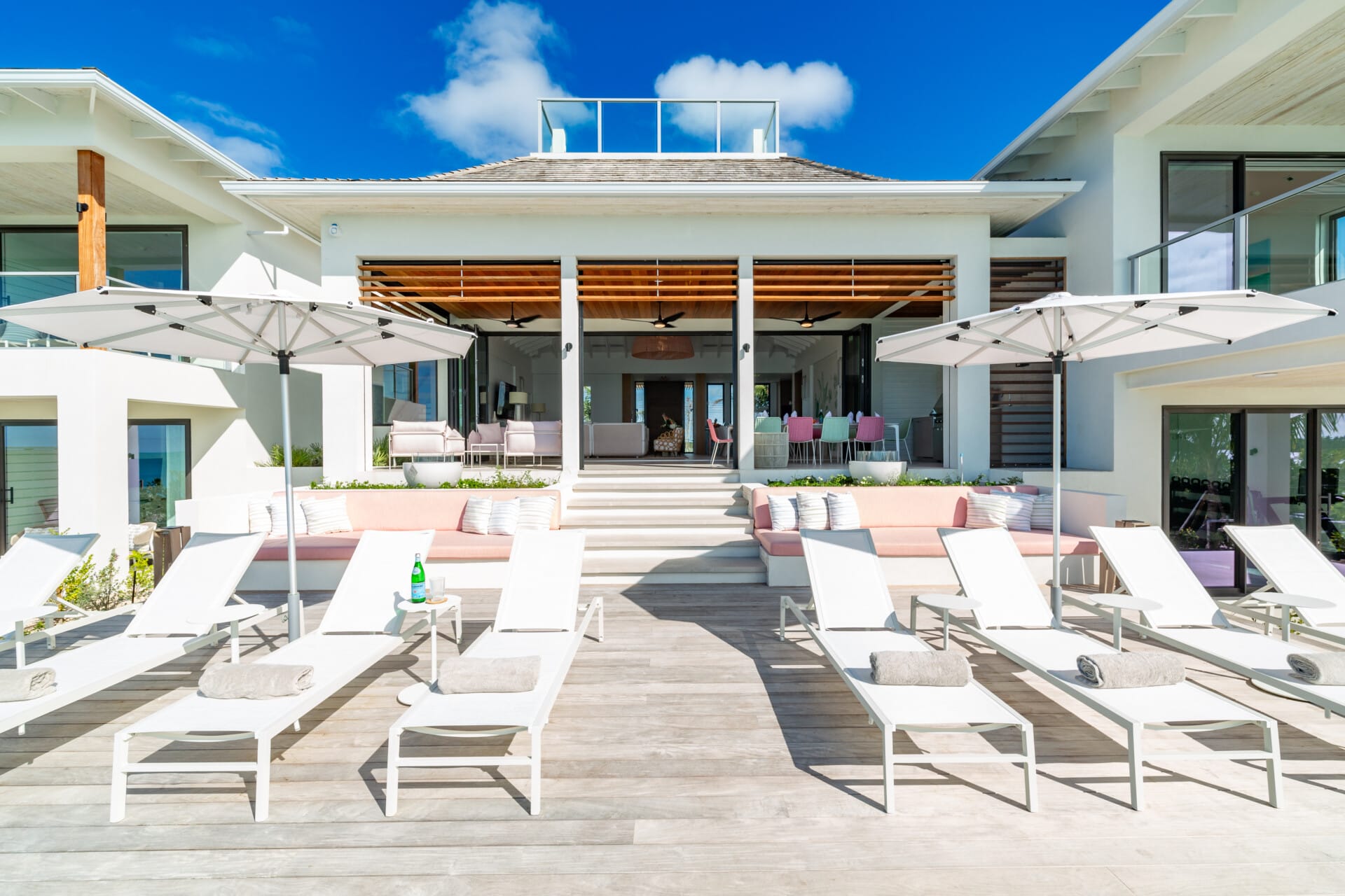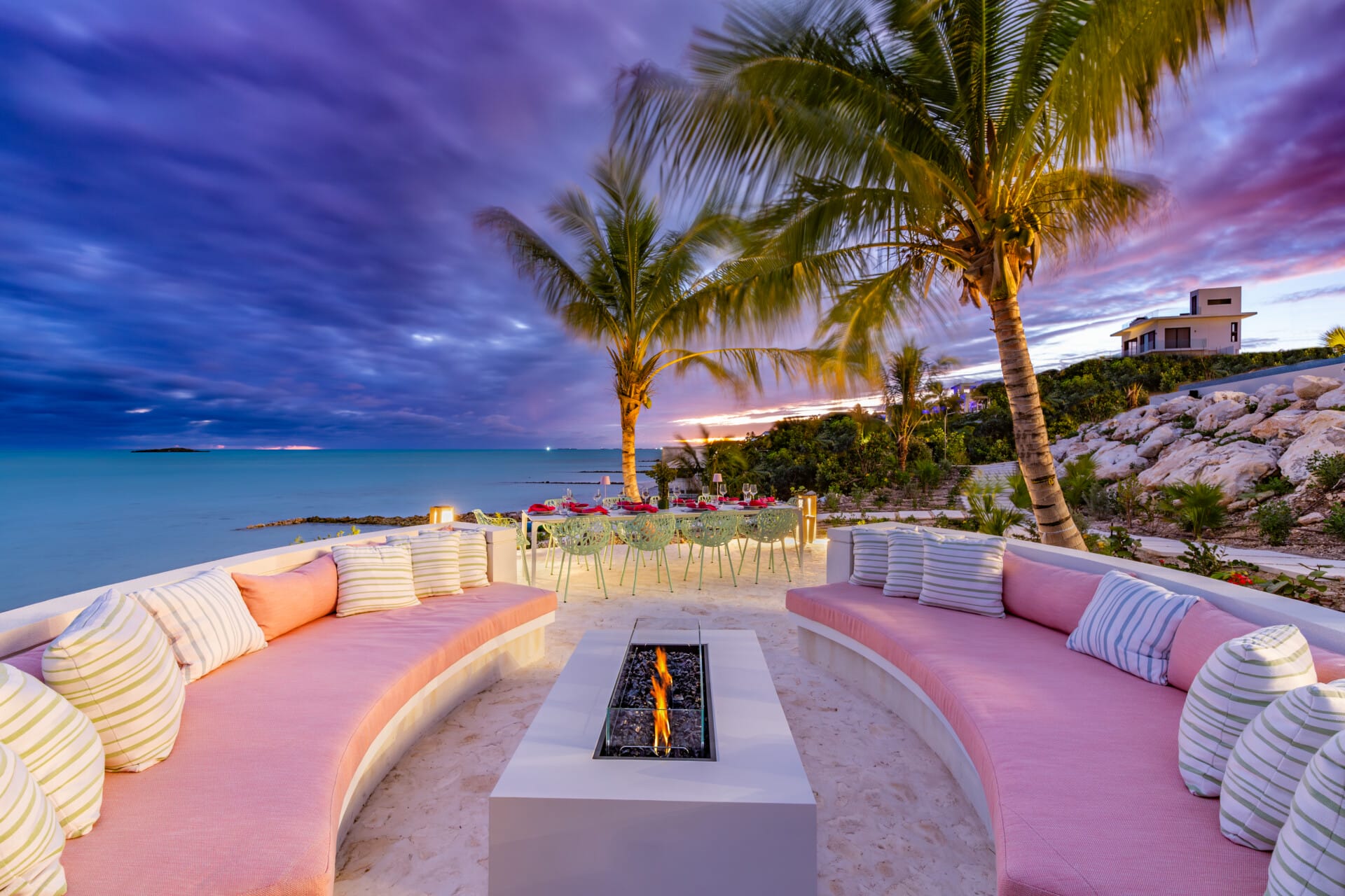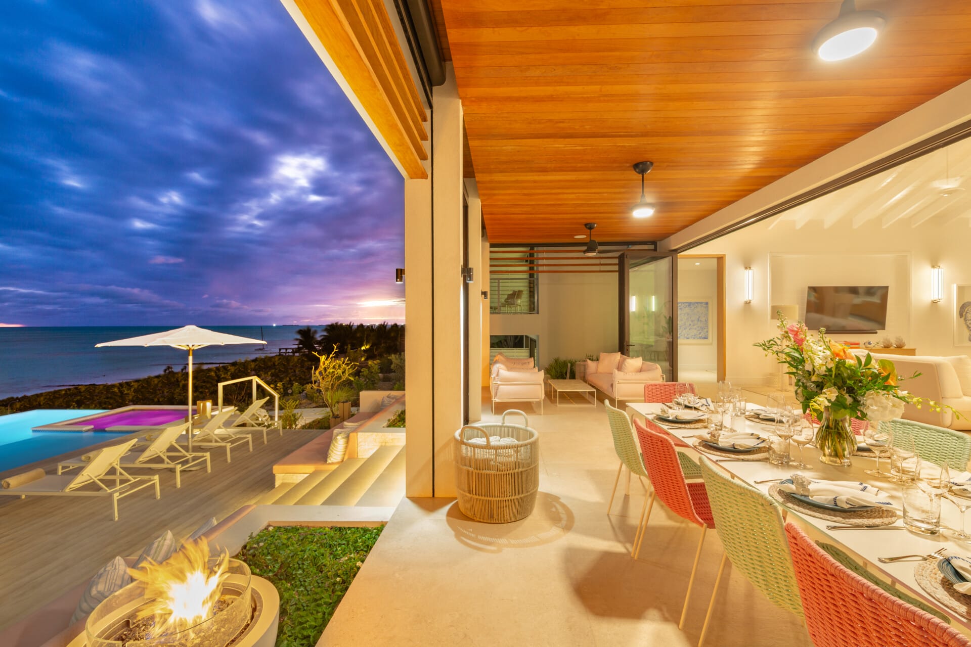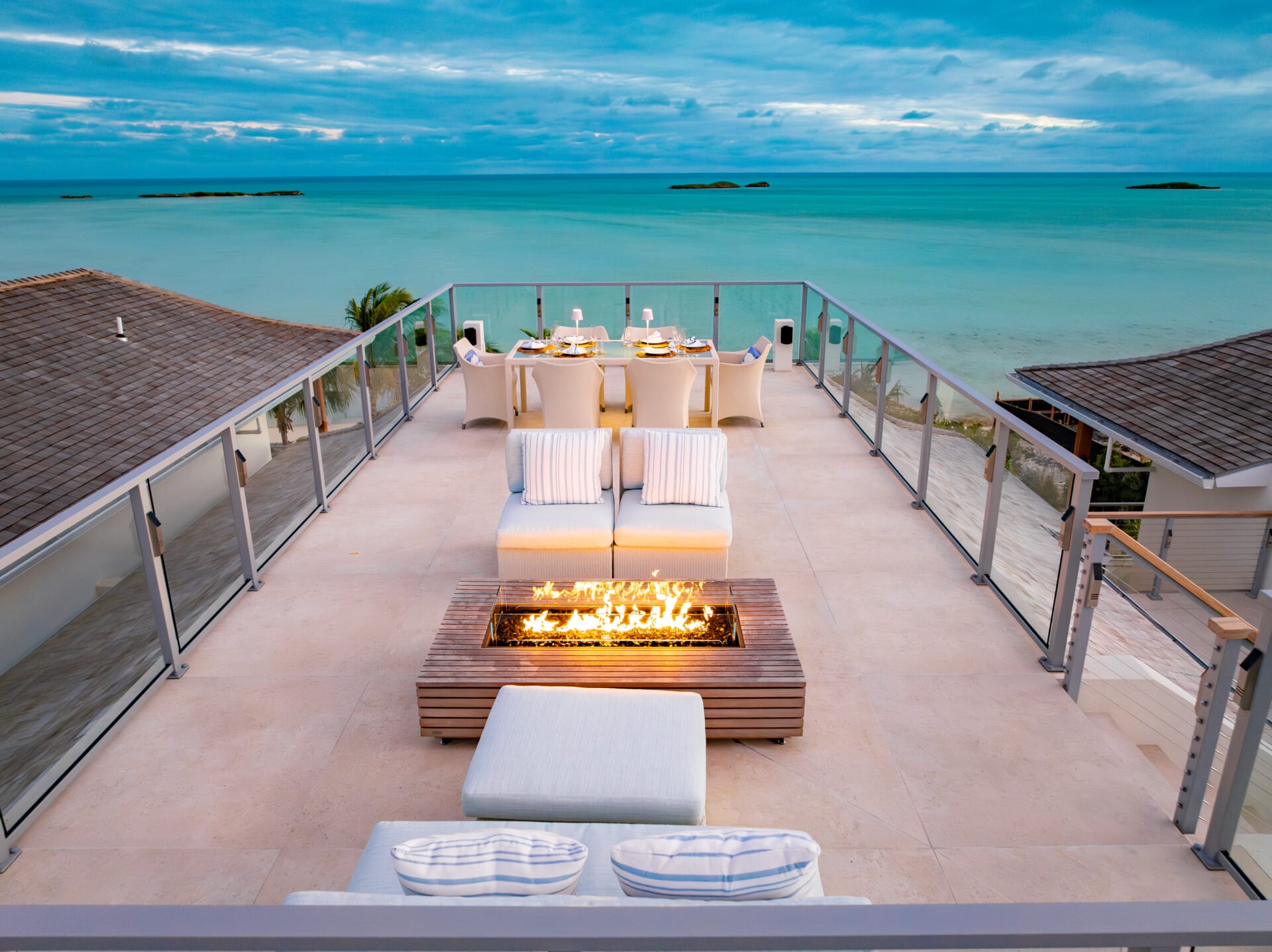 Outdoors, Bristol Breeze truly comes into its own. A heated swimming pool and hot tub sit between the villa and the sea, framed by firepits on the deck and shaded areas for dining and lounging. A beach deck and built in firepit with seating create an inviting setting for evenings by the water, while a rooftop terrace crowned with a distinctive shingle design offers yet another perspective, with space to gather around a firepit and watch both sunrise and sunset over the horizon. The seamless transition from house to terrace to beach makes every movement feel natural, despite the elevated site.
