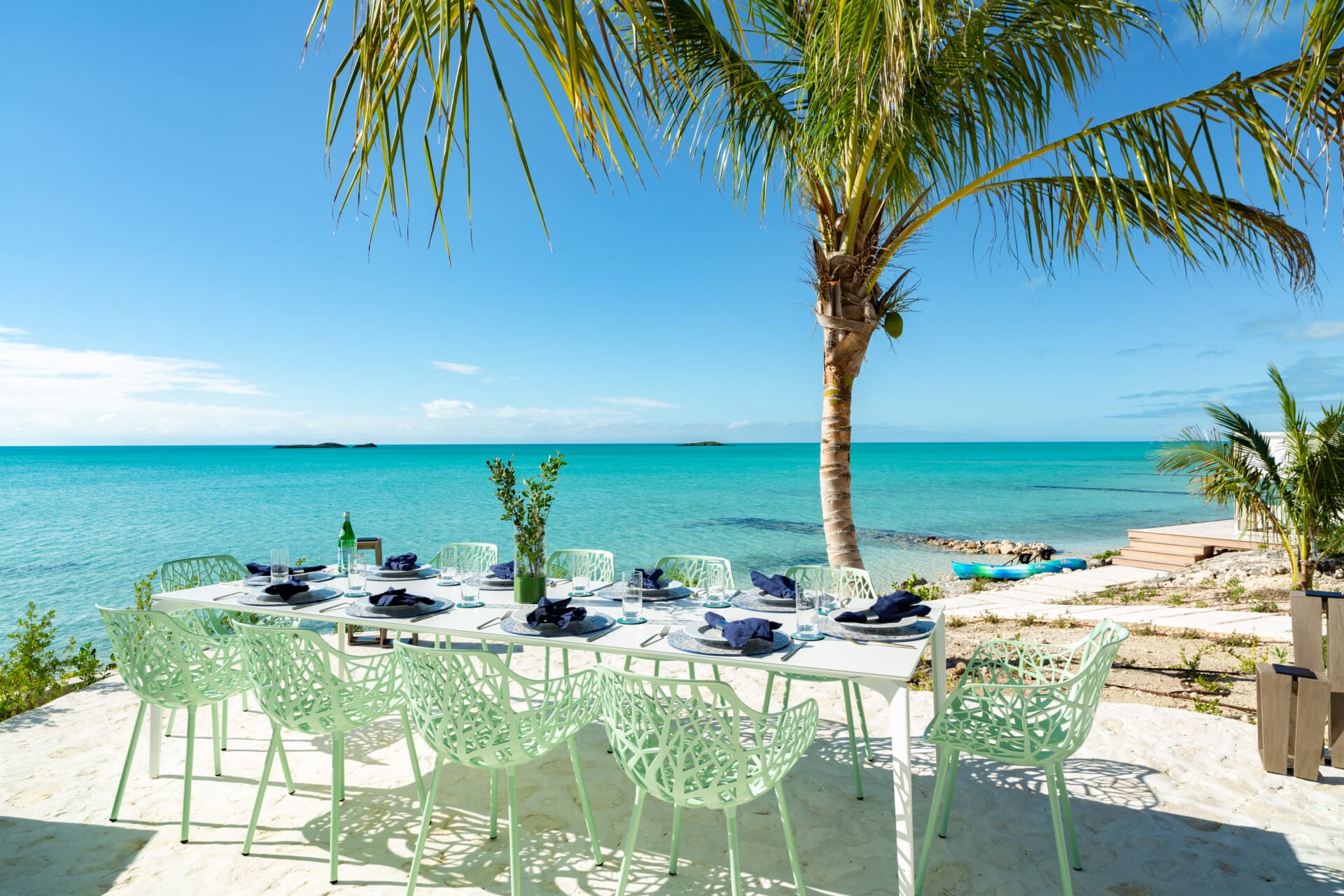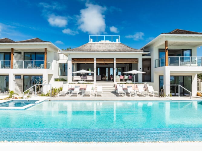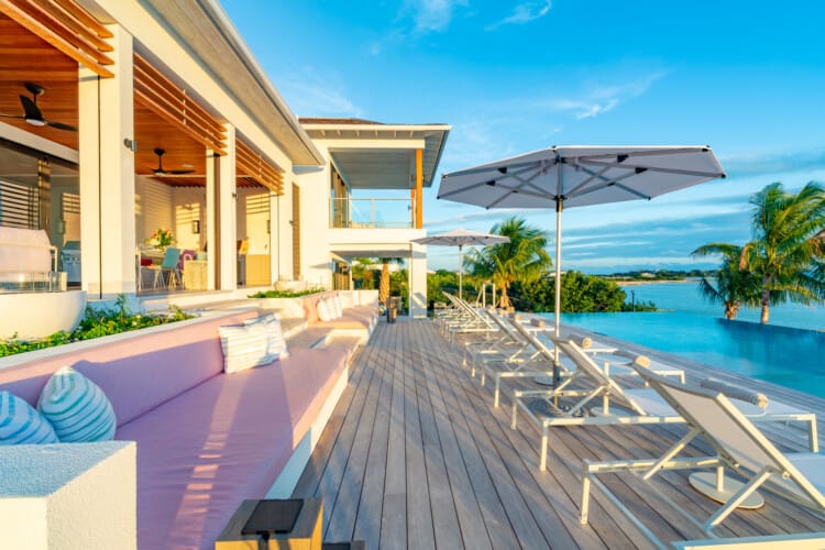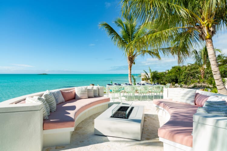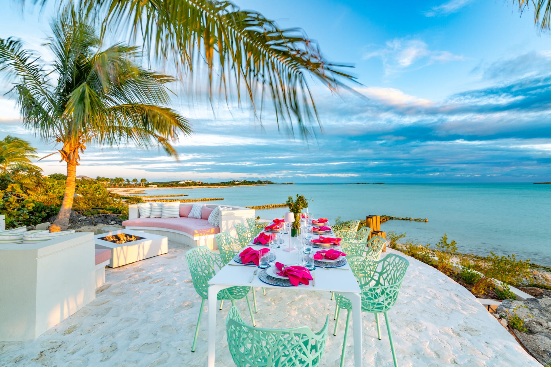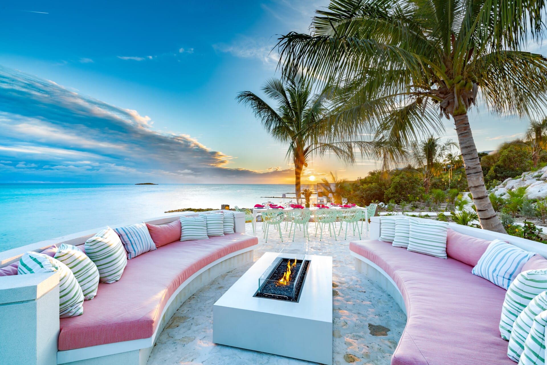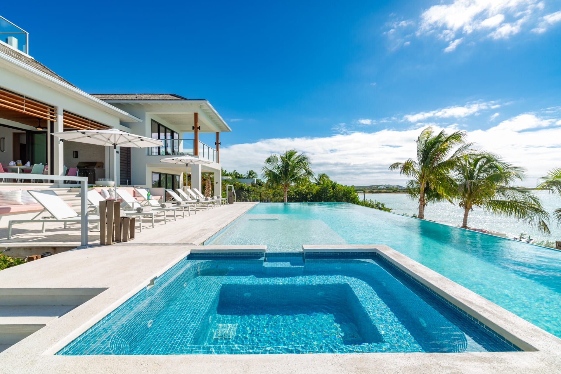 Outdoors, Bristol Breeze truly comes into its own. A heated swimming pool and hot tub sit between the villa and the sea, framed by firepits on the deck and shaded areas for dining and lounging. A beach deck and built in firepit with seating create an inviting setting for evenings by the water, while a rooftop terrace crowned with a distinctive shingle design offers yet another perspective, with space to gather around a firepit and watch both sunrise and sunset over the horizon. The seamless transition from house to terrace to beach makes every movement feel natural, despite the elevated site.