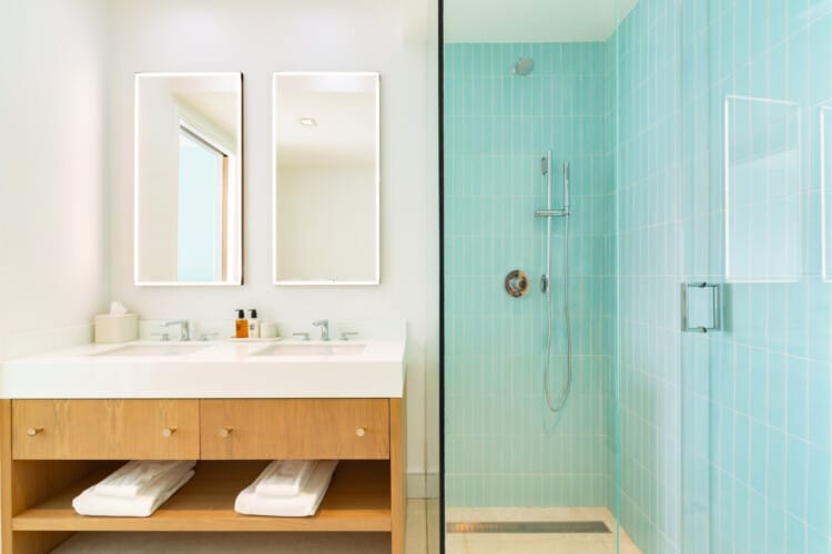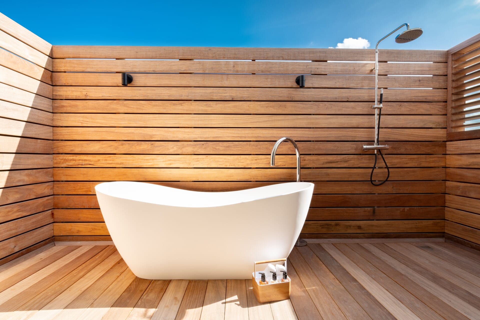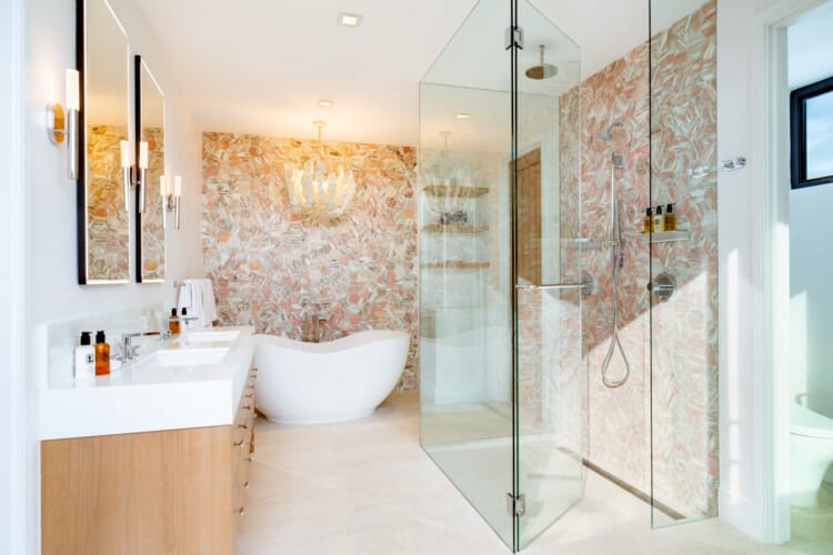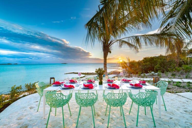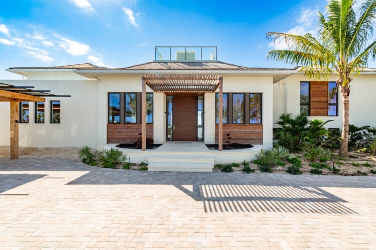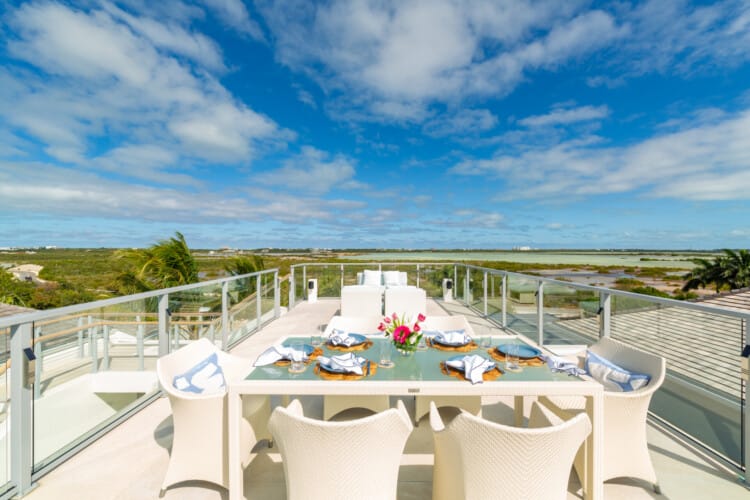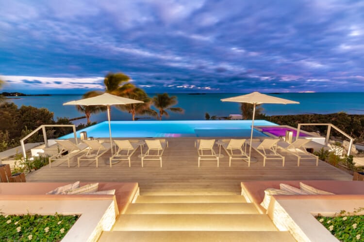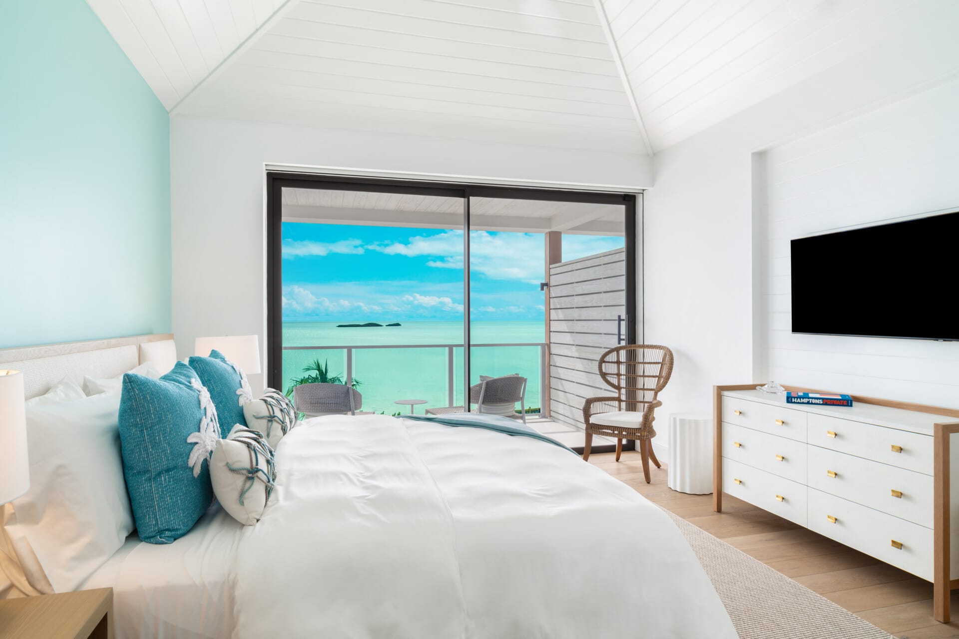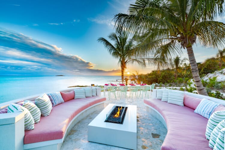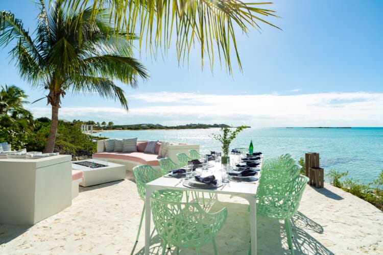 Outdoors, Bristol Breeze truly comes into its own. A heated swimming pool and hot tub sit between the villa and the sea, framed by firepits on the deck and shaded areas for dining and lounging. A beach deck and built in firepit with seating create an inviting setting for evenings by the water, while a rooftop terrace crowned with a distinctive shingle design offers yet another perspective, with space to gather around a firepit and watch both sunrise and sunset over the horizon. The seamless transition from house to terrace to beach makes every movement feel natural, despite the elevated site.