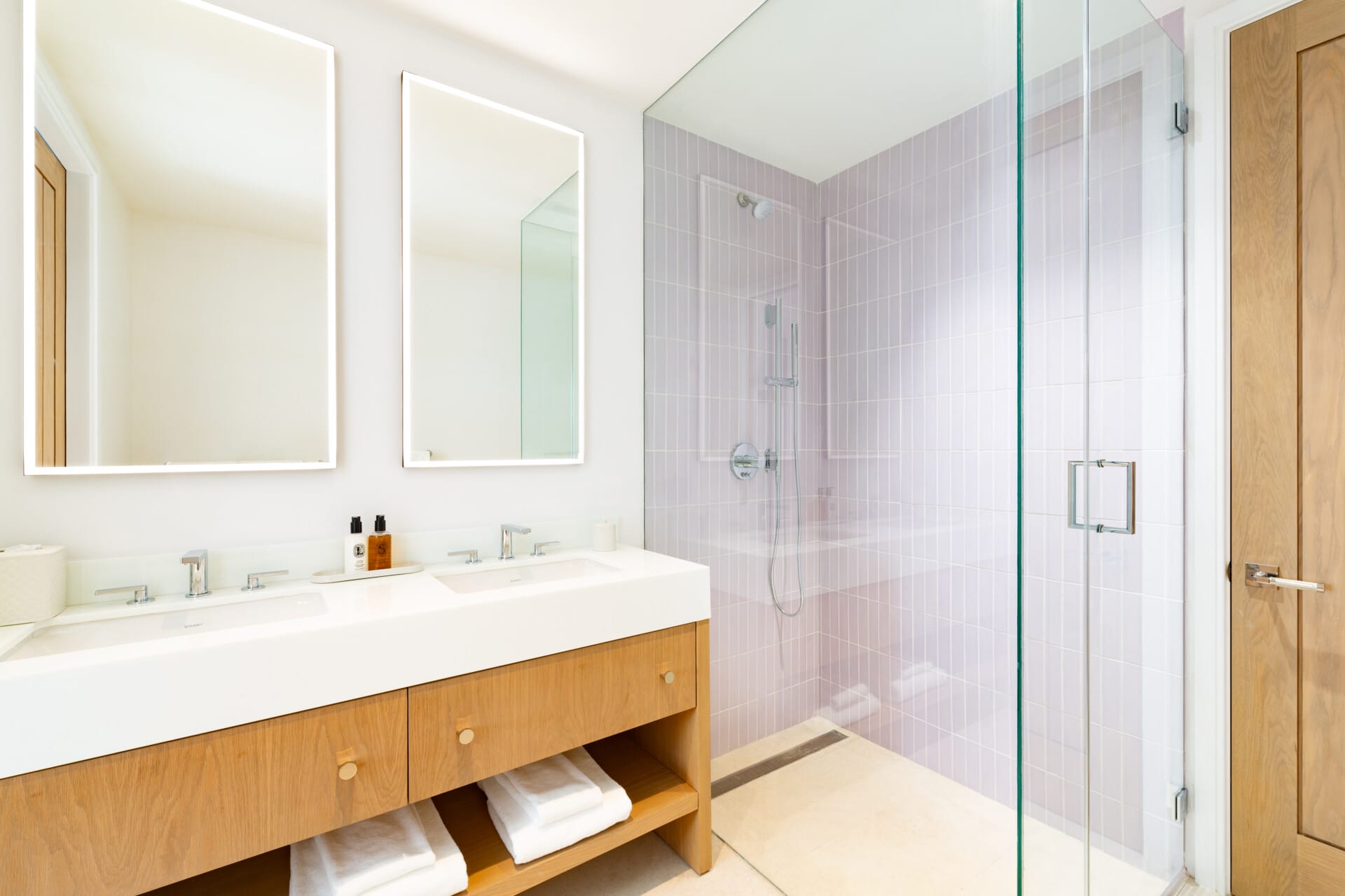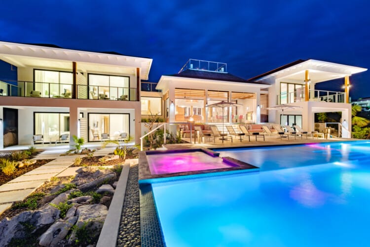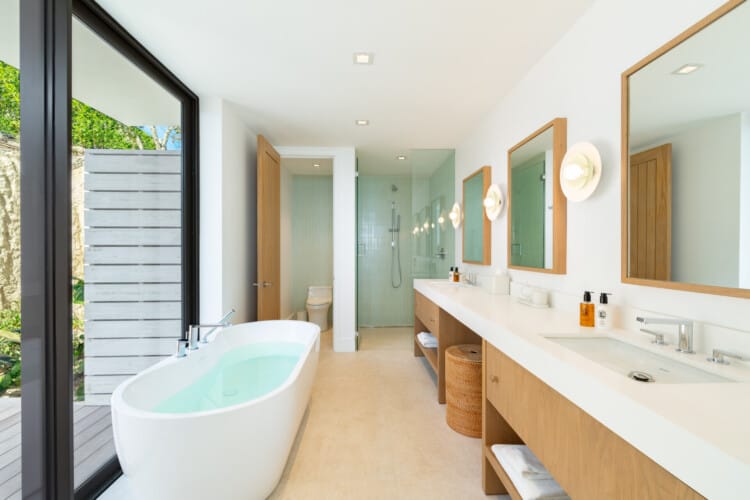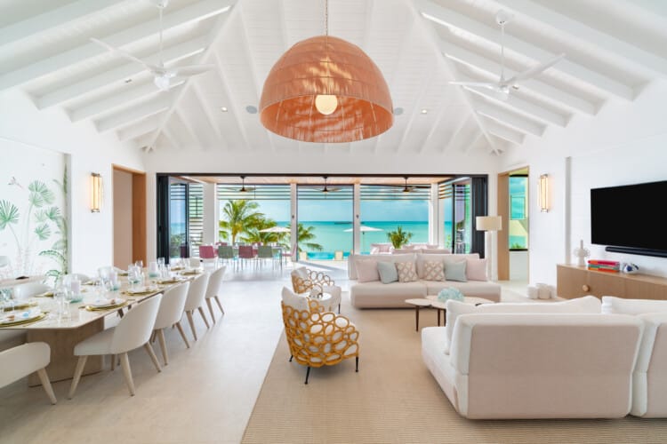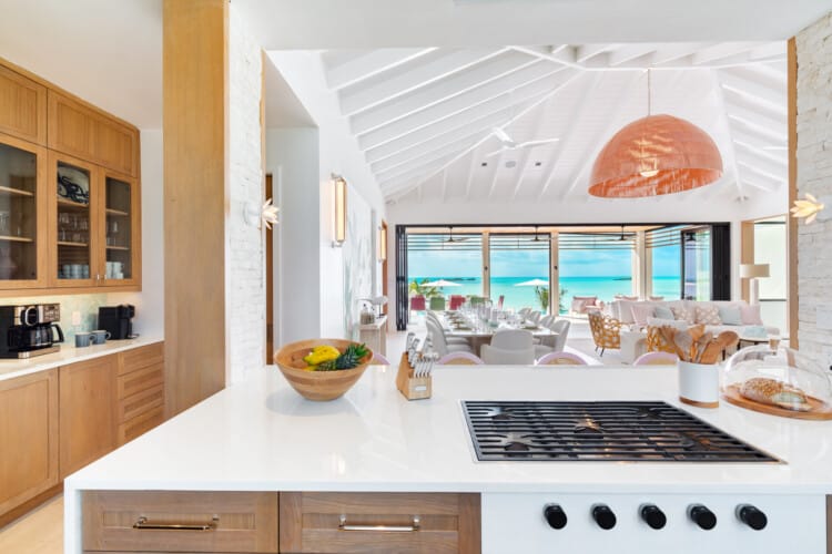 Inside, the atmosphere is warm and contemporary, shaped by natural materials that soften the clean architectural lines. Native stone, hardwood boarding, whitewashed woods and cool tile floors combine to create spaces that feel tactile and inviting. The Great Room brings together living, dining and kitchen areas in a way that feels both expansive and intimate, with the chef’s kitchen and bar thoughtfully tucked into their own defined corner while remaining part of the wider social space. Bedrooms sit just a half level from the main living area, allowing for privacy without isolation and ensuring a sense of closeness for families and friends sharing the villa.