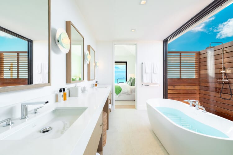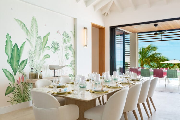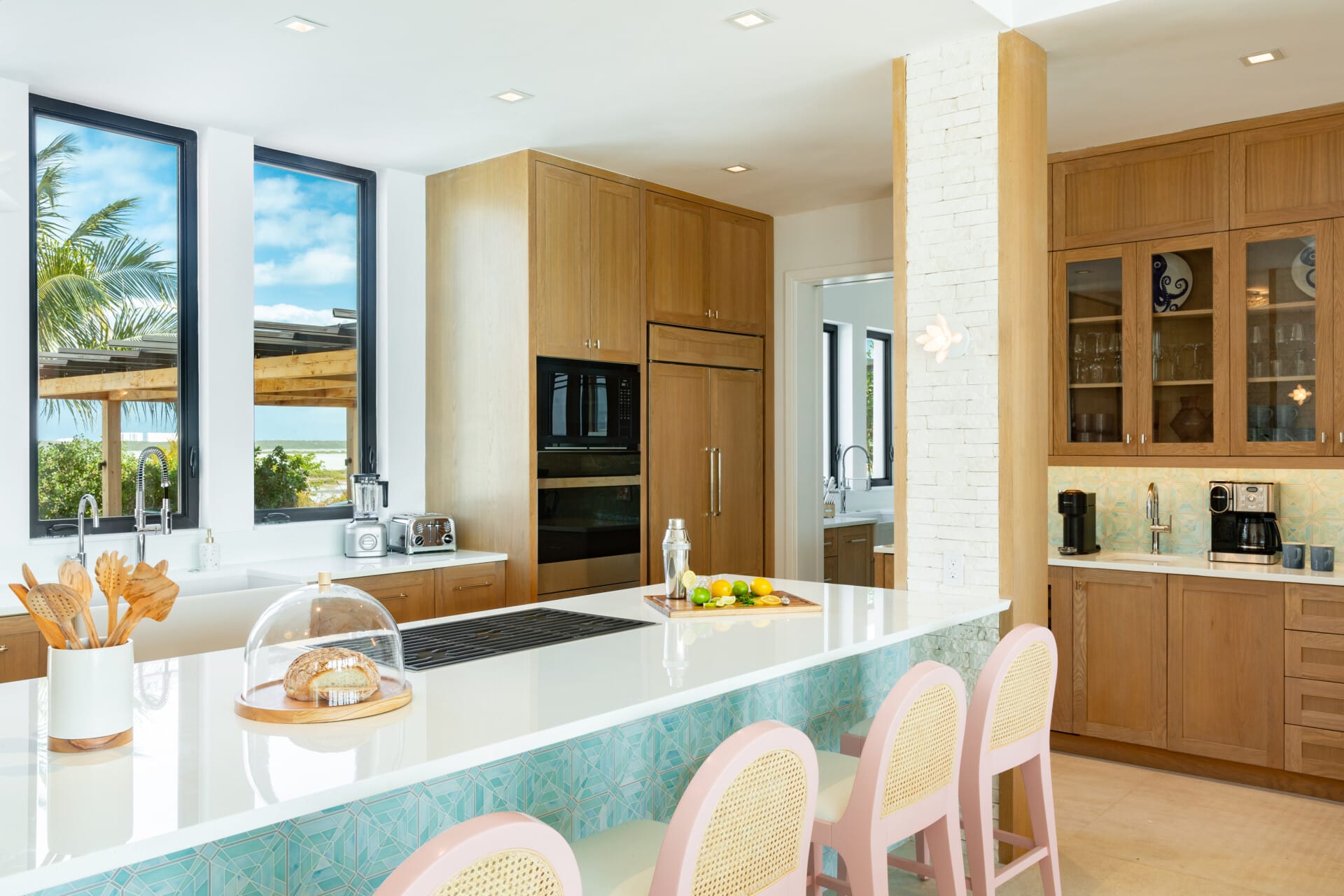 Each of the five oceanfront bedrooms has been designed to embrace the views, with king beds, open concept cabinetry and blackout blinds for restful nights. The principal suite occupies a privileged position in the west wing, complete with indoor and outdoor bathing spaces, a private balcony and sunrise views that bathe the room in soft morning light. Several bathrooms feature open air showers, offering a beautifully immersive way to connect with the sea breeze and surrounding nature. Throughout the house, thoughtful touches such as a dedicated office, fully equipped gym with ocean views, family kitchen, laundry facilities and seamless technology enhance comfort without detracting from the calm aesthetic.