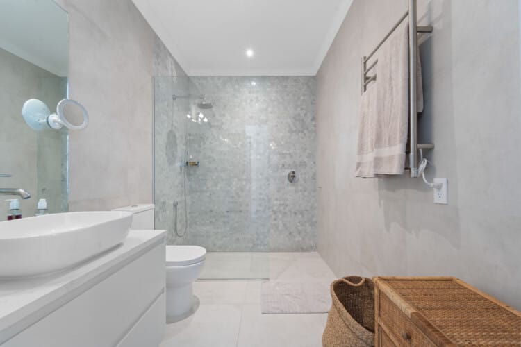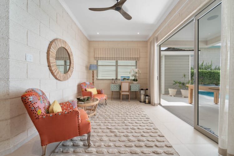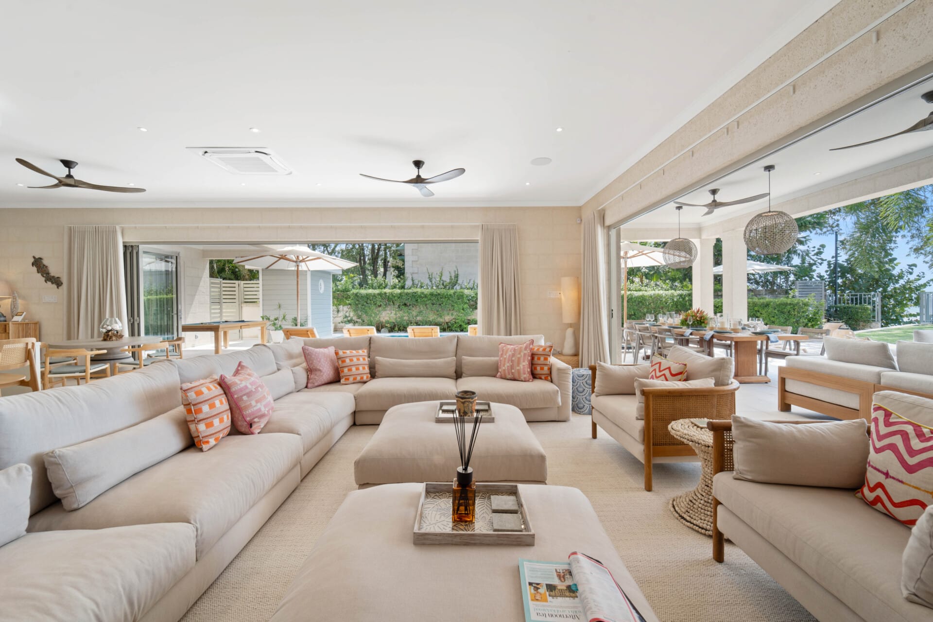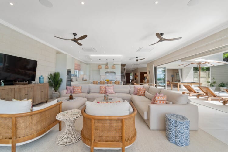 The calming sounds of water features and a tranquil koi pond, sets the tone for total relaxation. The spacious open-plan layout, features a sleek kitchen, cozy media room, and contemporary lounge which seamlessly flows out to an expansive pool deck. Bi-fold doors open wide to let in warm ocean breezes, or close for cool, air-conditioned comfort when desired.