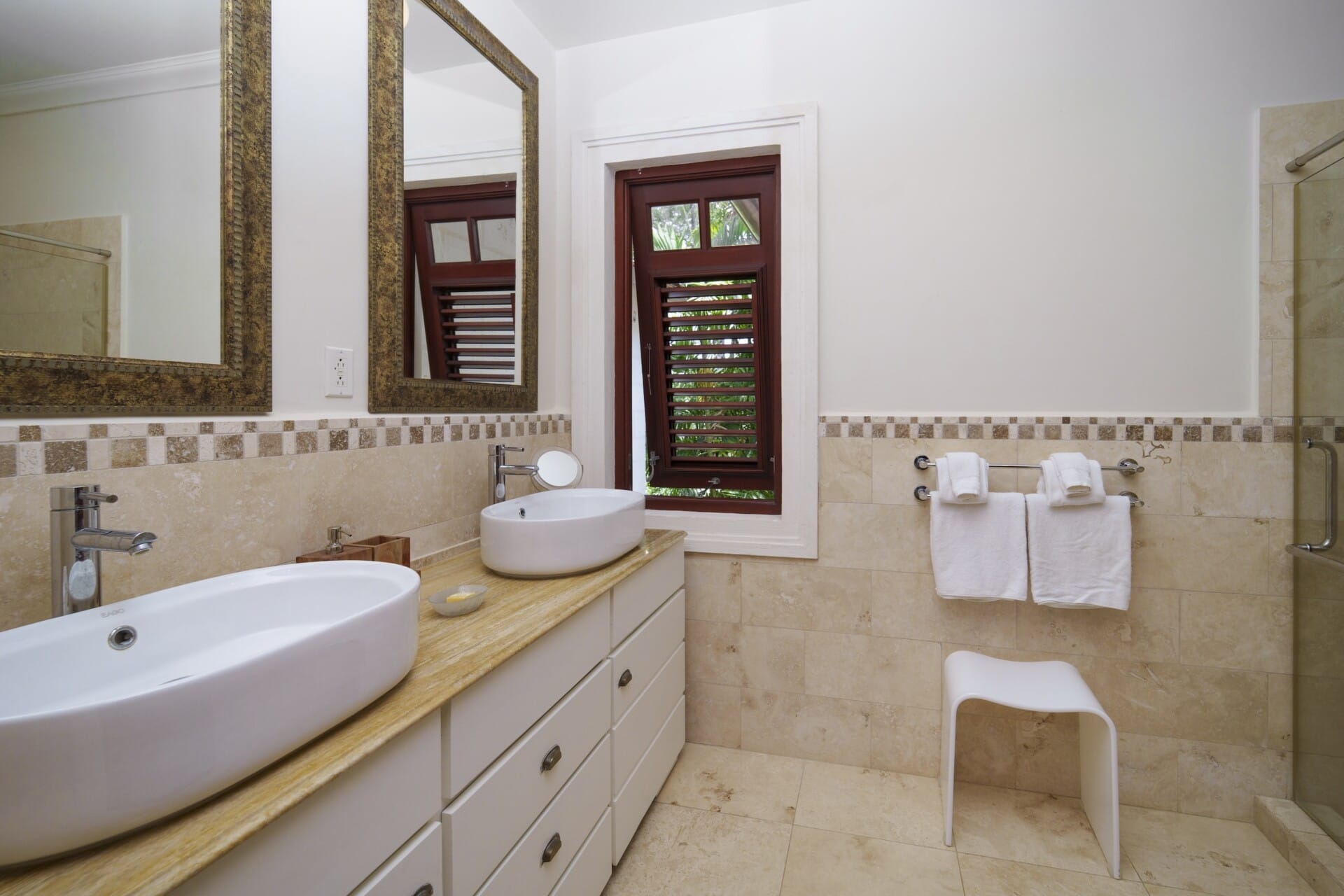 The villa features three luxurious en-suite bedrooms, each with a king-sized bed (two can be configured as twins), spacious walk-through closets, and private terraces or balconies for a peaceful retreat.