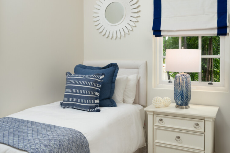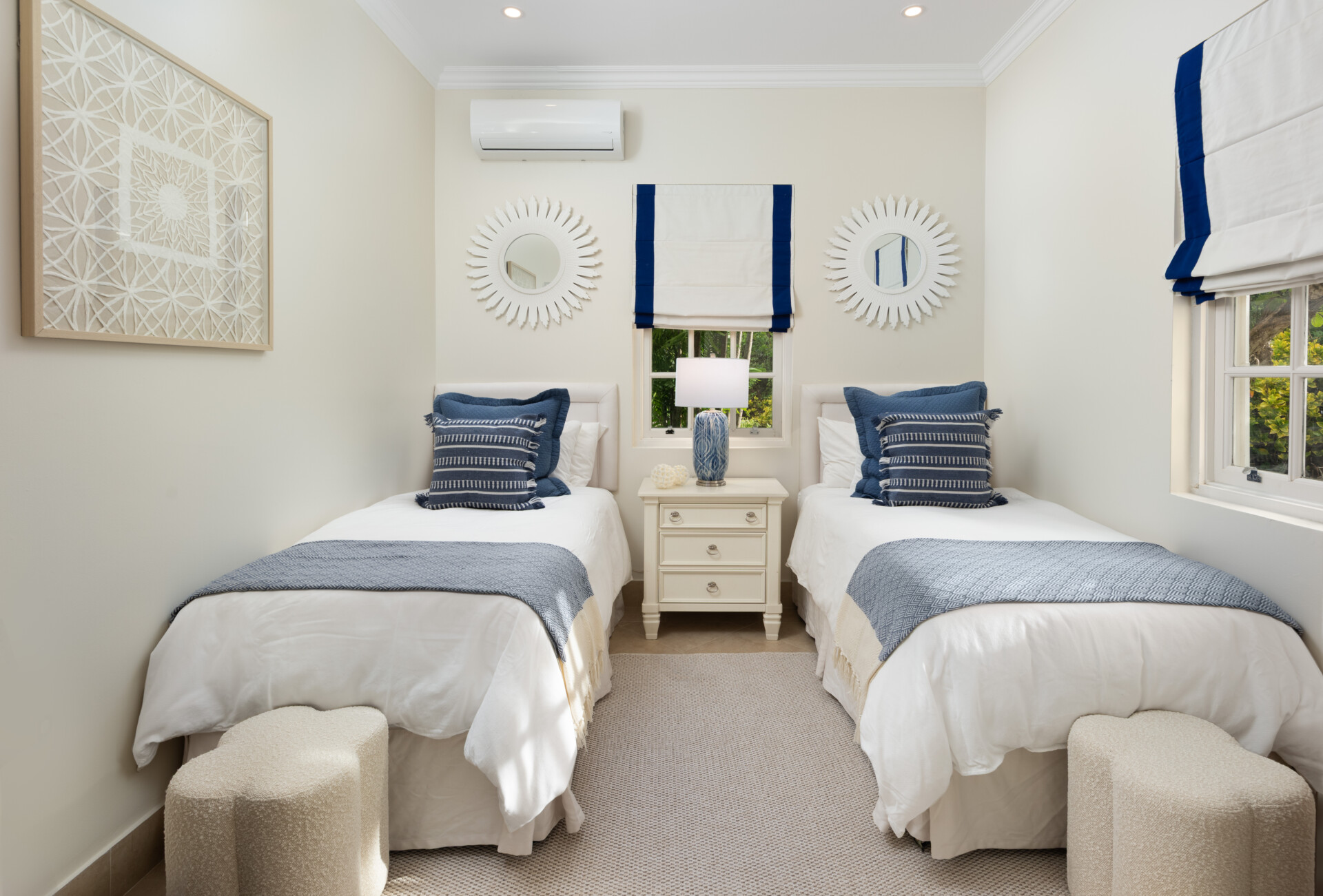 There is so much space, and so many living options in the villa, and yet there’s a lovely sense of intimacy thanks to soft, elegant furnishings. Guests can relax and luxuriate in the surroundings while observing glorious Caribbean sunsets. At the garden level is a self-contained suite which has one twin and one queen bedroom. Both bedrooms boast an ensuite and air conditioning. Between the bedrooms is a living space and galley kitchen. A sofa-bed provides extra accommodation. This is helpful if a young family accompanied by a nanny is staying in the suite, or even a group of young adults. The upper level boasts 3 king suites with ensuite bathrooms that include oversized tubs for indulgent bathing.