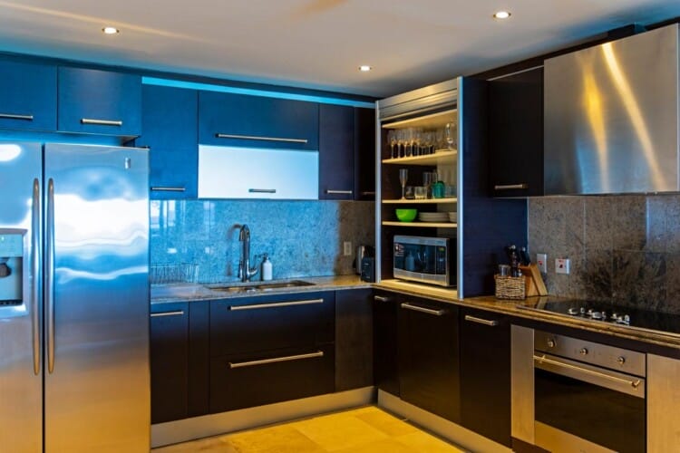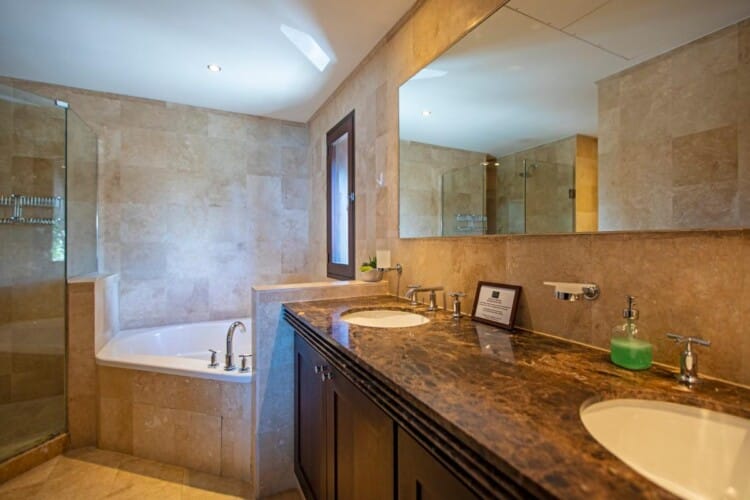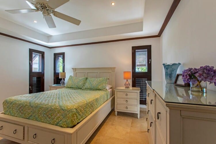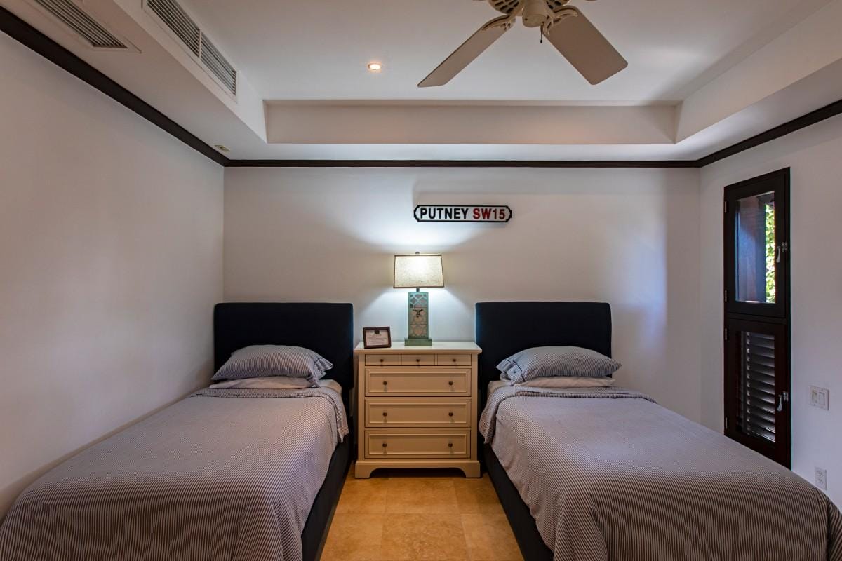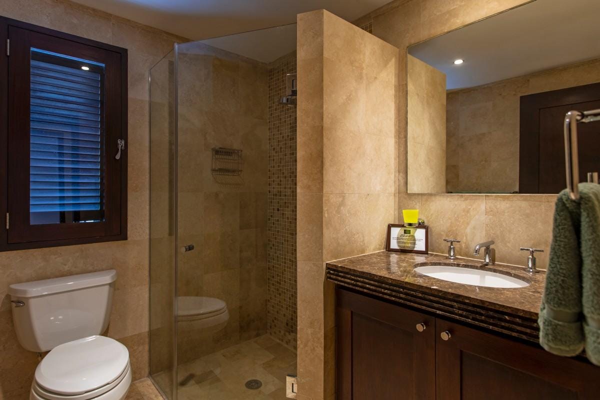 The master bedroom features a king bed and glass doors that open directly onto the balcony, allowing sea views to greet you each morning. Its en suite limestone bathroom includes twin basins, a generous bath, and a walk in shower, creating a spa like retreat. The second bedroom offers a queen bed with its own en suite bathroom and walk in shower, while the third bedroom can be arranged as twins or converted to a king, making it ideal for children or additional guests. All bedrooms are air conditioned and include ceiling fans for added comfort.