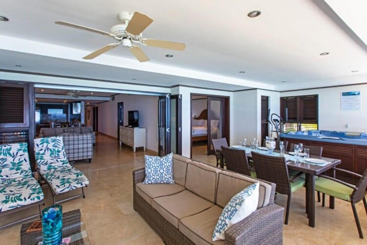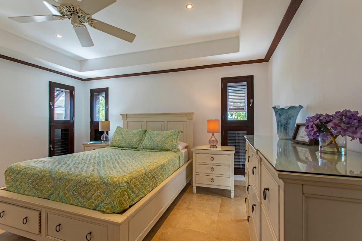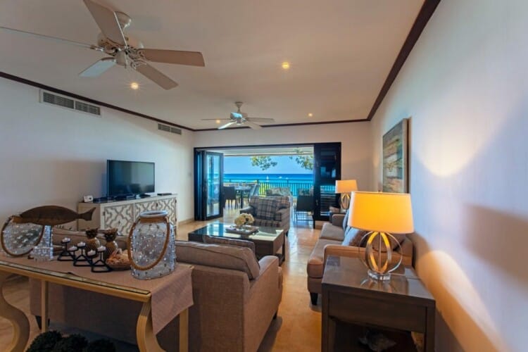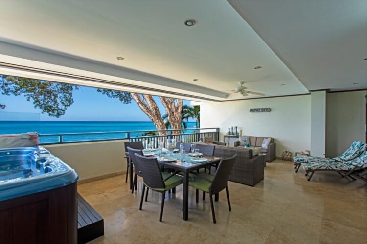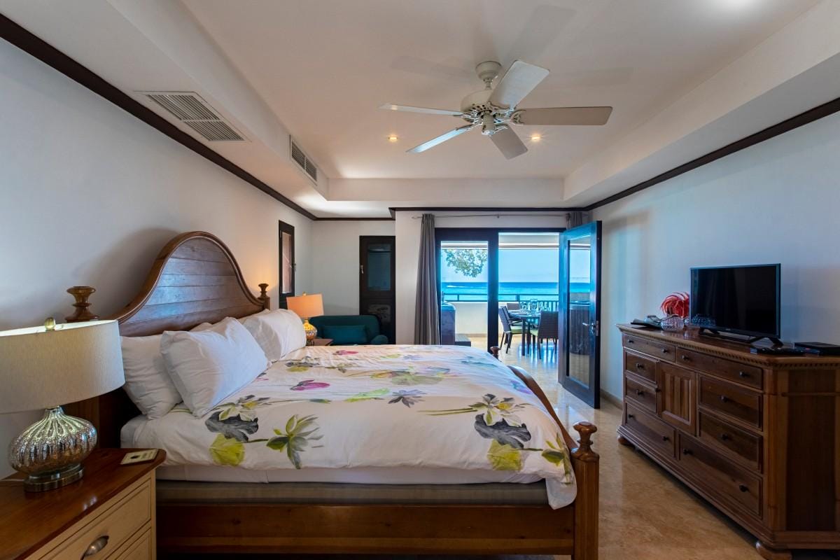 Coral Cove 4, also known as Green Fields, is a beautifully appointed first floor apartment offering over two thousand four hundred square feet of refined living space. Designed with outdoor living in mind, the apartment opens onto a generous private balcony where a large jacuzzi invites long, relaxing afternoons overlooking the Caribbean Sea. From here, uninterrupted views stretch across sapphire waters and soft white sand, with the manicured gardens below creating a sense of calm and privacy.