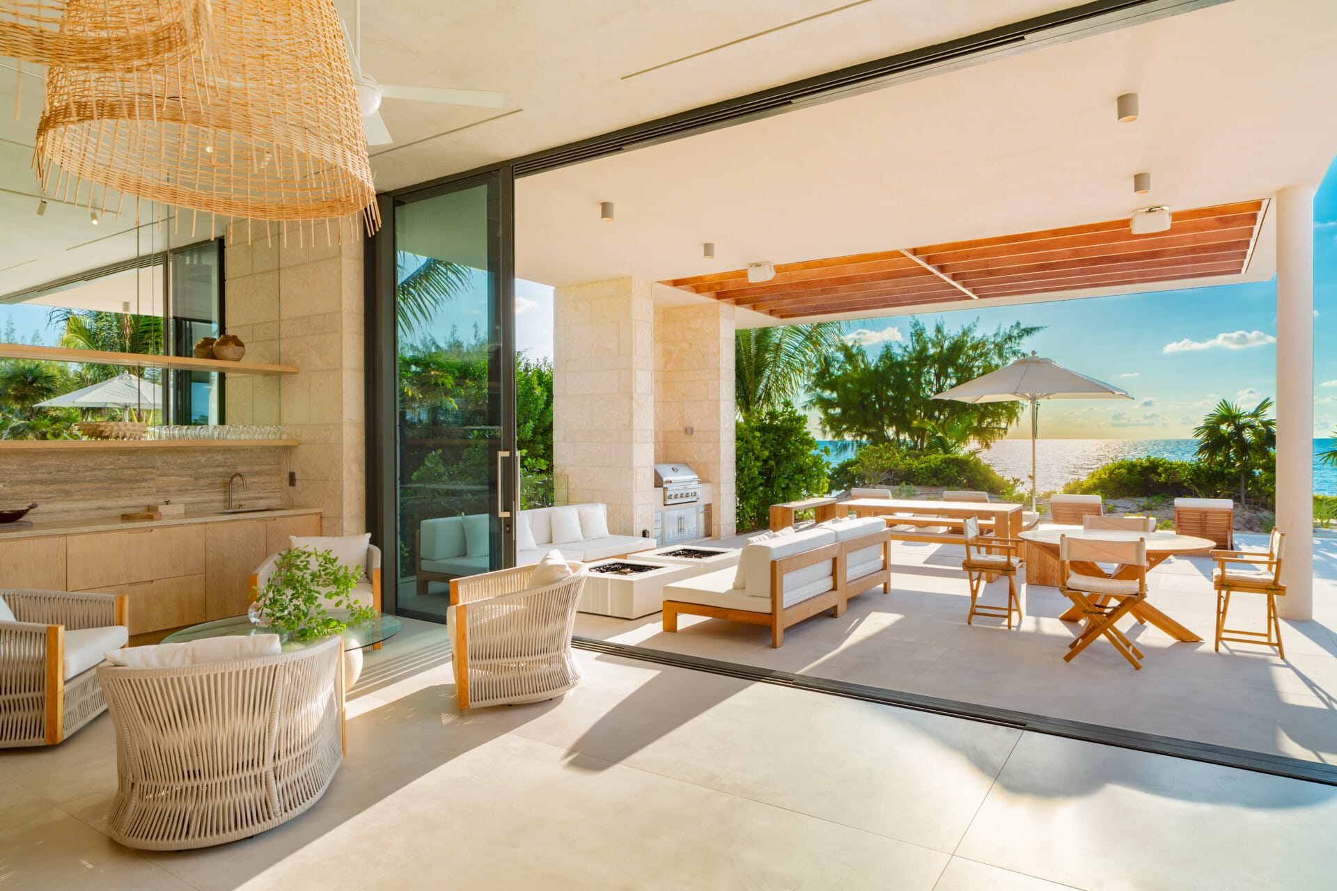 Dune House sits lightly on one of the most peaceful stretches of Long Bay Beach, offering a sense of calm that is felt the moment you arrive. Designed with refined Belgian and Scandinavian influences, the home balances clean architectural lines with natural textures, creating an atmosphere that is both elegant and effortlessly relaxed. High ceilings and expansive glass draw the outdoors in, framing views of lush tropical planting and the ever changing shades of clear aqua water beyond .