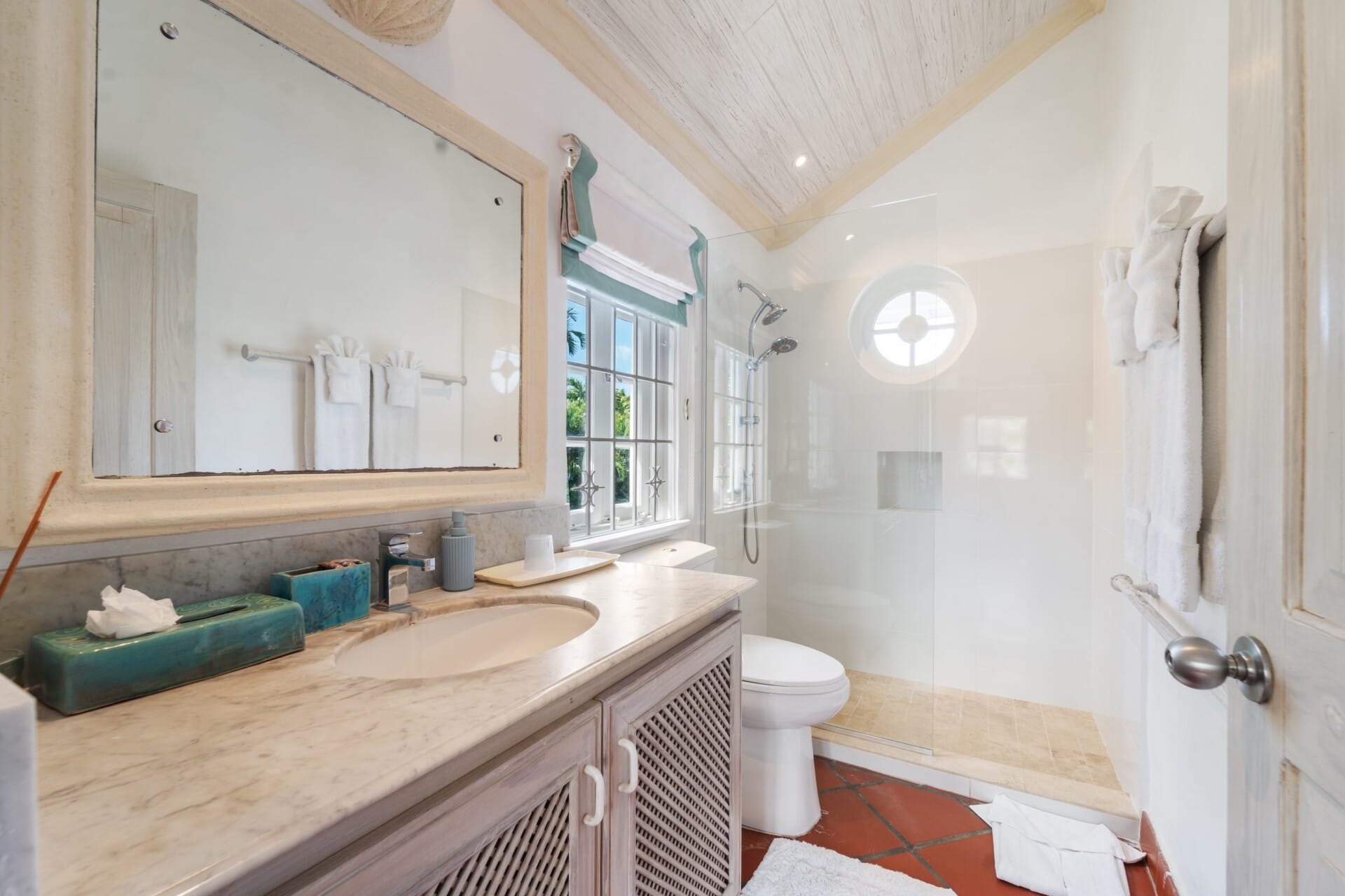 Each villa features three generously proportioned air-conditioned bedrooms, ensuring privacy and comfort for all guests. With two bedrooms on the upper level and one on the ground floor, every guest enjoys convenience and tranquility. Step onto your private patio to admire sweeping Caribbean Sea views, complemented by en suite bathrooms in every bedroom. Ceiling fans throughout the villa enhance the tropical ambiance with a soothing breeze.
