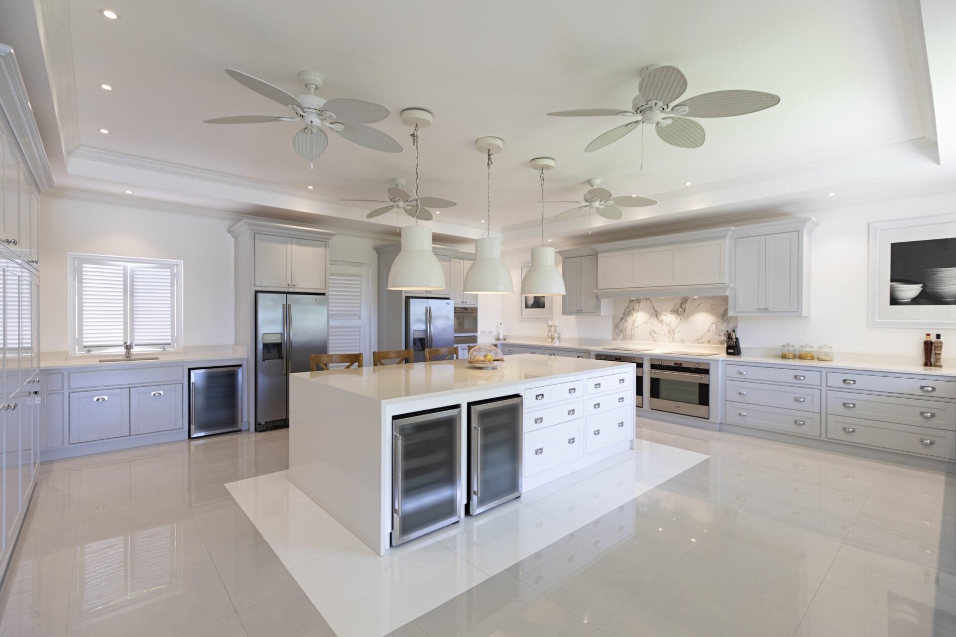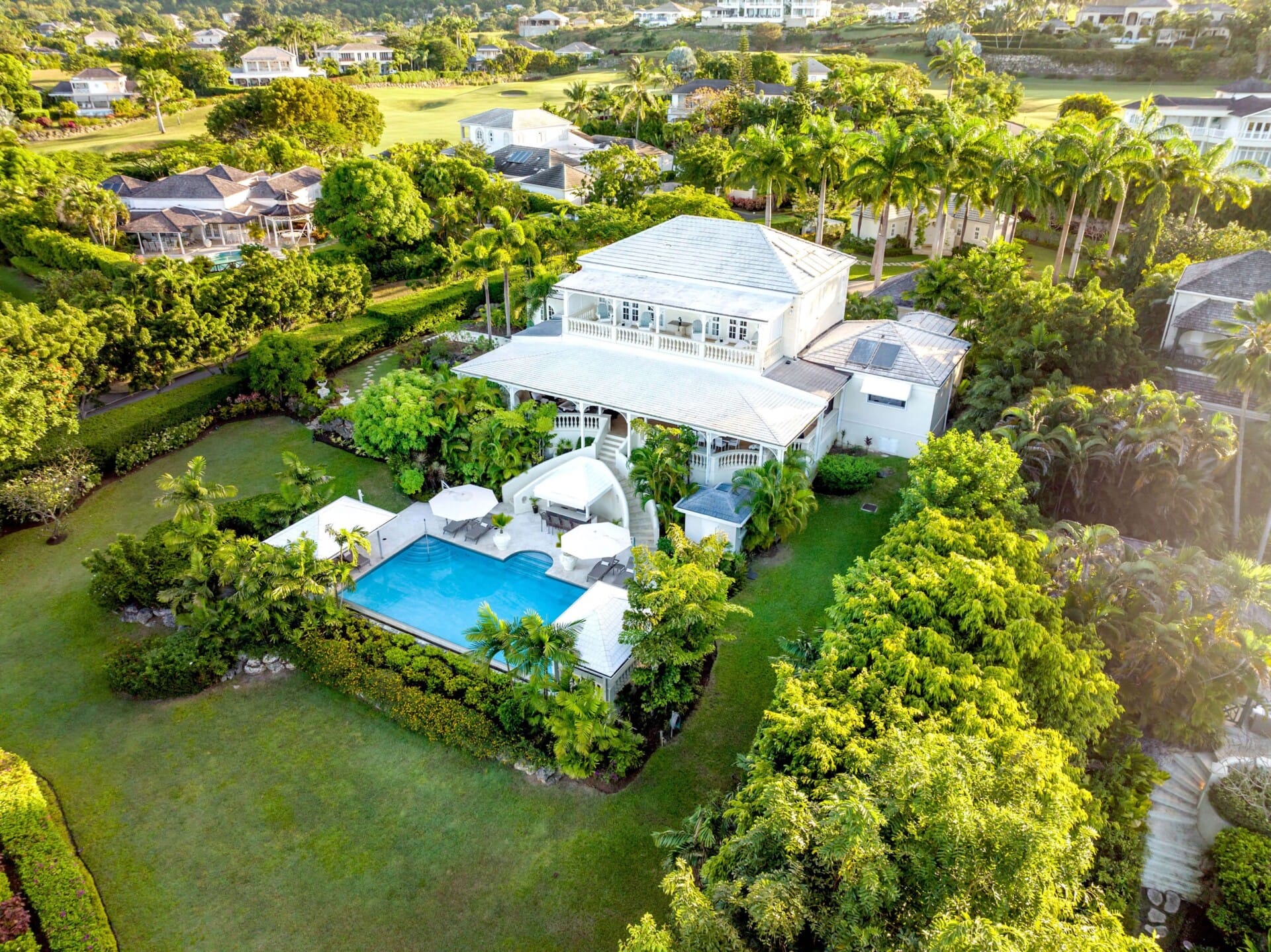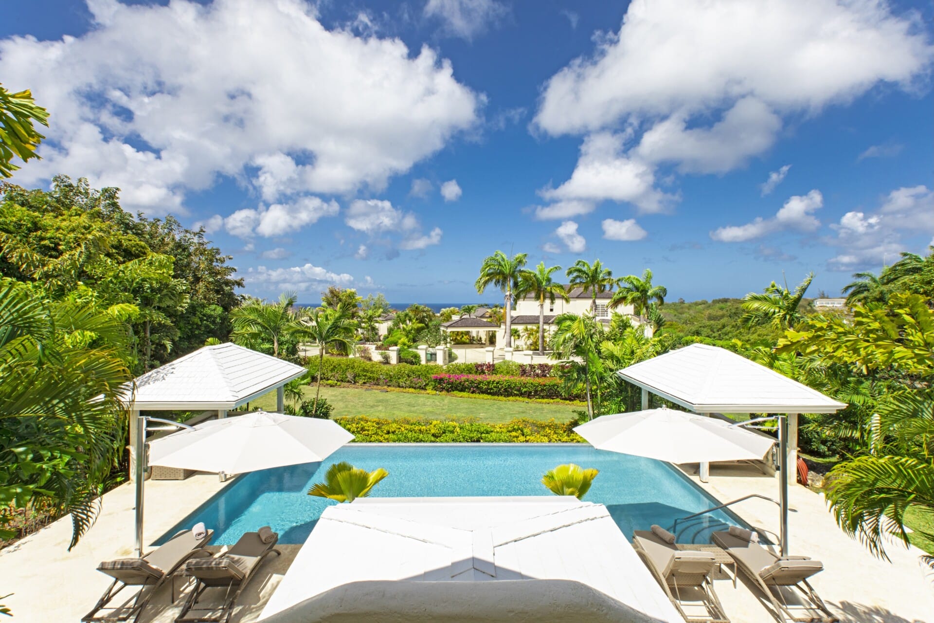 The heart of the home is its expansive outdoor living. A wide covered veranda sets the scene for long lunches and sunset cocktails, overlooking the infinity pool and lush gardens. Poolside gazebos, loungers, a bathroom, and outdoor shower make this a space for relaxation and entertaining alike, while a Sonos sound system ensures the perfect soundtrack to island living.