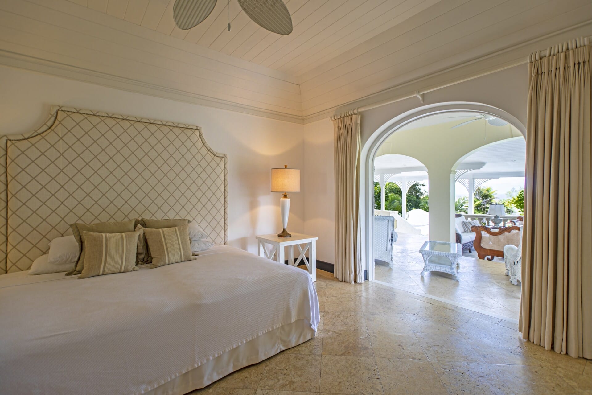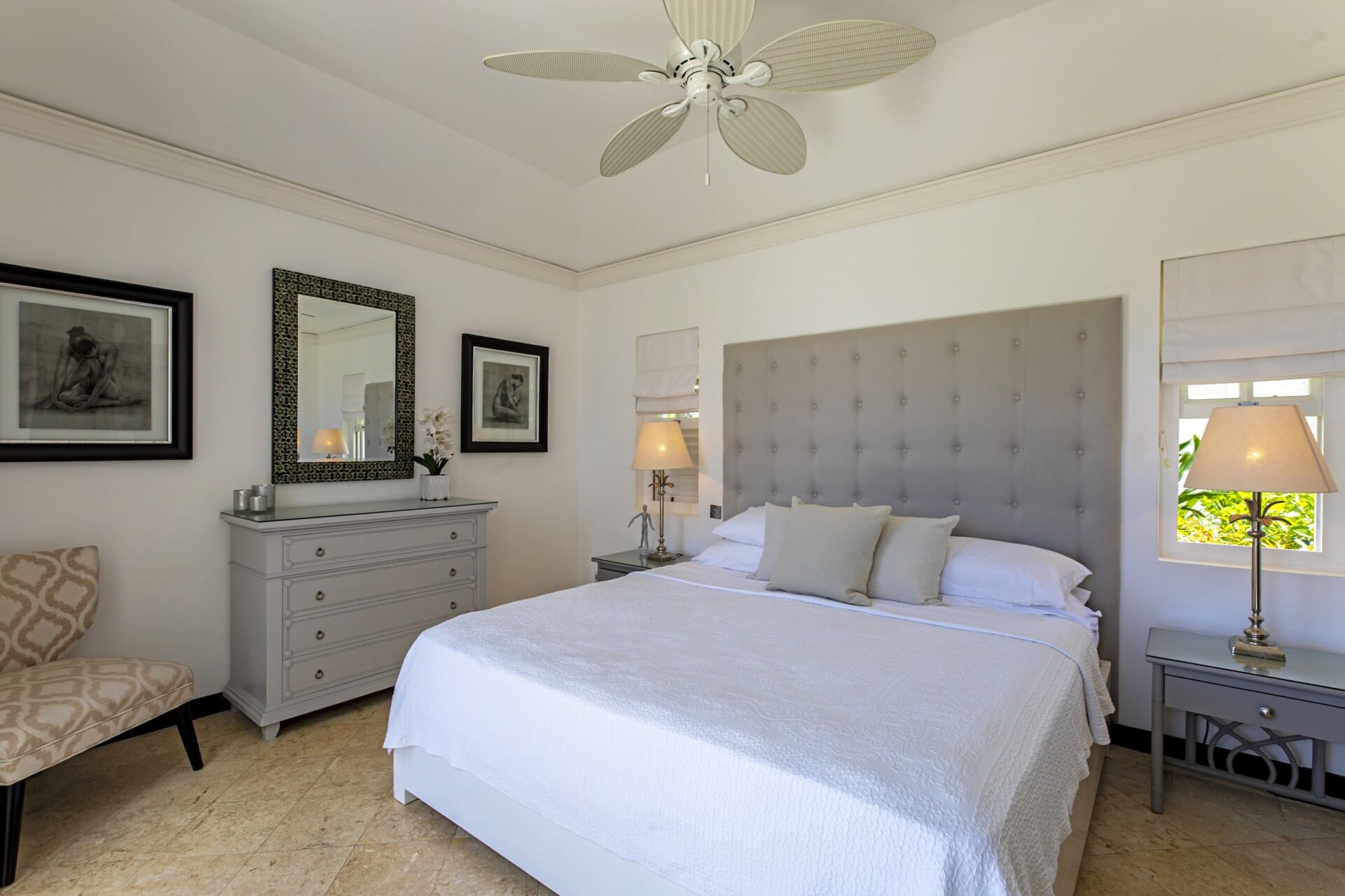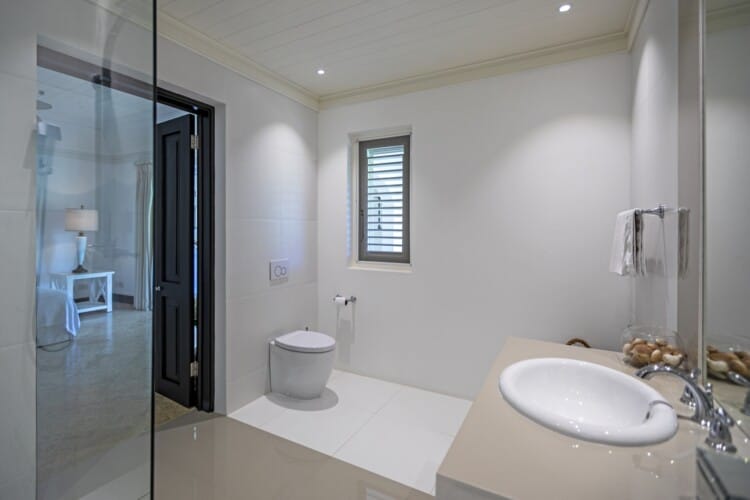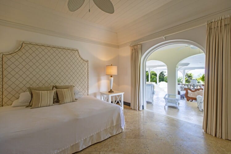 High ceilings and airy interiors create an inviting atmosphere at Fig Tree House. Two ground-floor bedrooms open onto private terraces, while upstairs, two master suites lead to a furnished balcony with views over tropical gardens and the Caribbean Sea. Each suite includes generous storage and spa-like bathrooms with double vanities, oversized showers, and a statement bathtub.