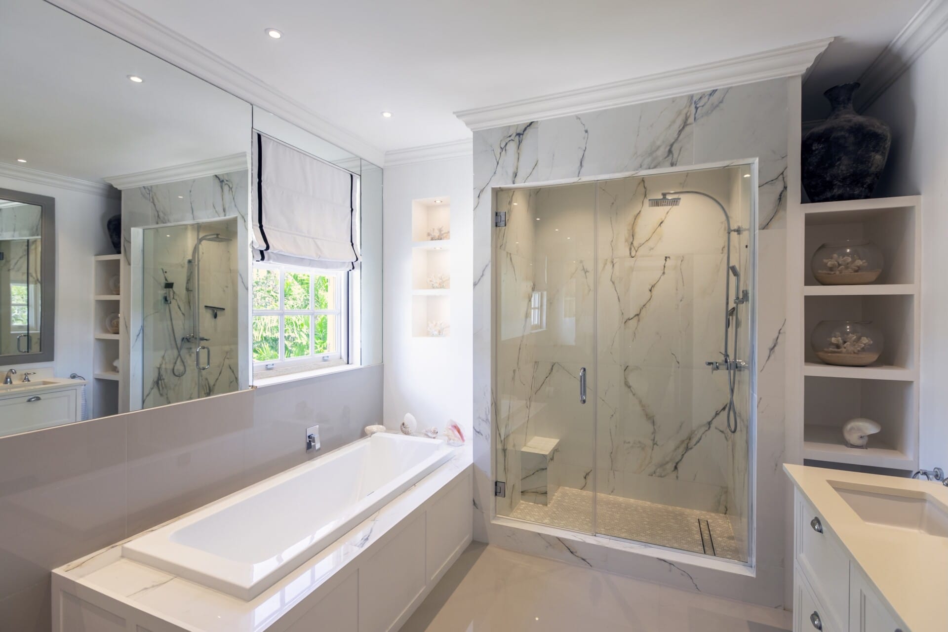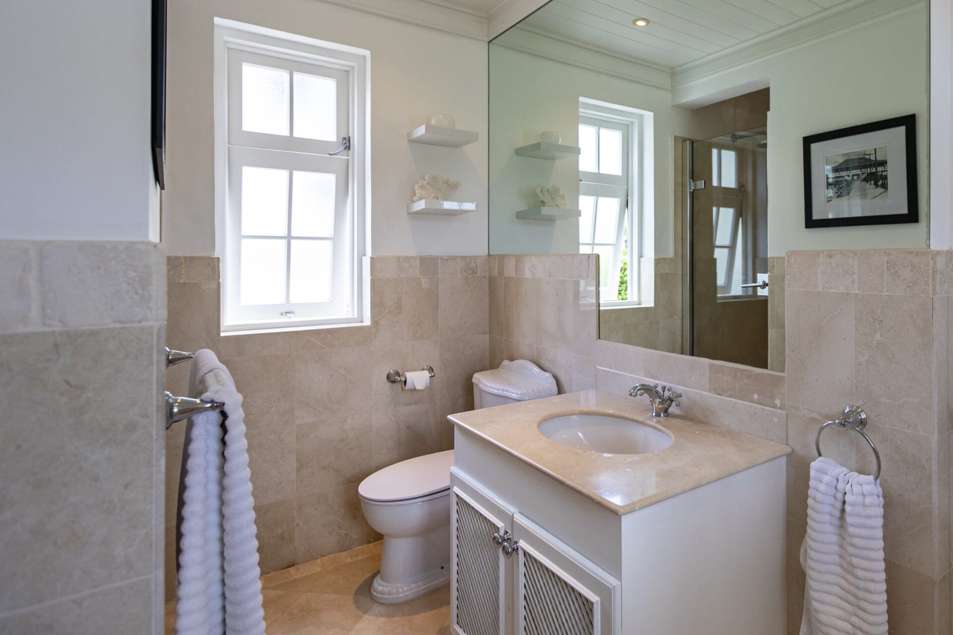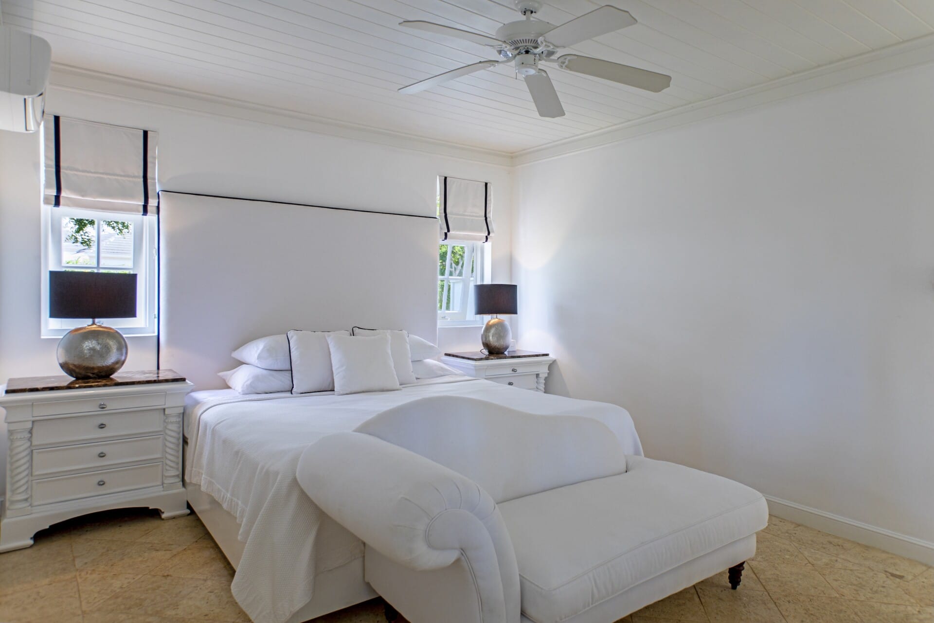 High ceilings and airy interiors create an inviting atmosphere at Fig Tree House. Two ground-floor bedrooms open onto private terraces, while upstairs, two master suites lead to a furnished balcony with views over tropical gardens and the Caribbean Sea. Each suite includes generous storage and spa-like bathrooms with double vanities, oversized showers, and a statement bathtub.