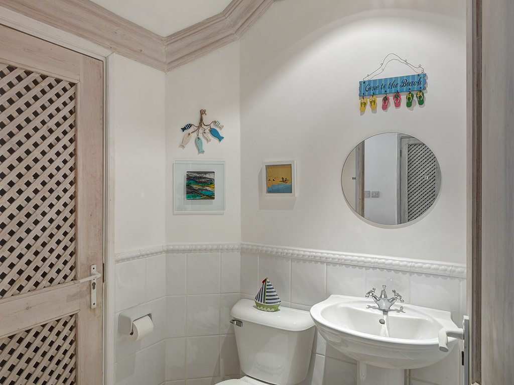 The villa’s upper level living spaces are light filled and inviting, flowing naturally onto private terraces that overlook the golf course, landscaped grounds, and the sea beyond. The fully equipped kitchen makes casual dining a pleasure, whether preparing a leisurely breakfast or evening drinks to enjoy as the sky softens into dusk. Indoor and outdoor living blend seamlessly, creating an atmosphere that is calm, breezy, and perfectly suited to island life.