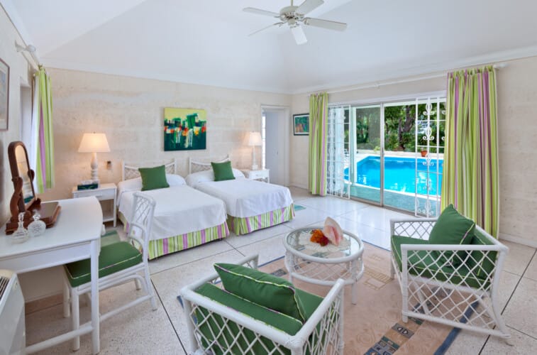 Each of the three en suite bedrooms is air-conditioned and thoughtfully appointed for comfort and privacy. The layout includes a cozy TV lounge just off the kitchen, offering a casual space to unwind before slipping outside to enjoy the villa’s private pool. Spacious and serene, the pool area is designed for long days in the sun, whether you’re swimming, sunbathing, or enjoying Maxine’s signature rum punch.