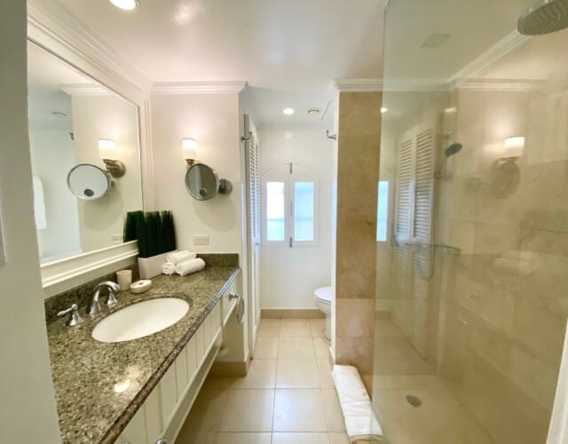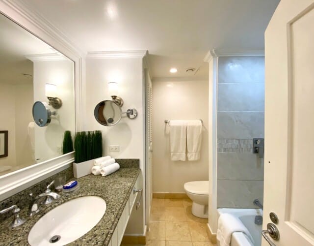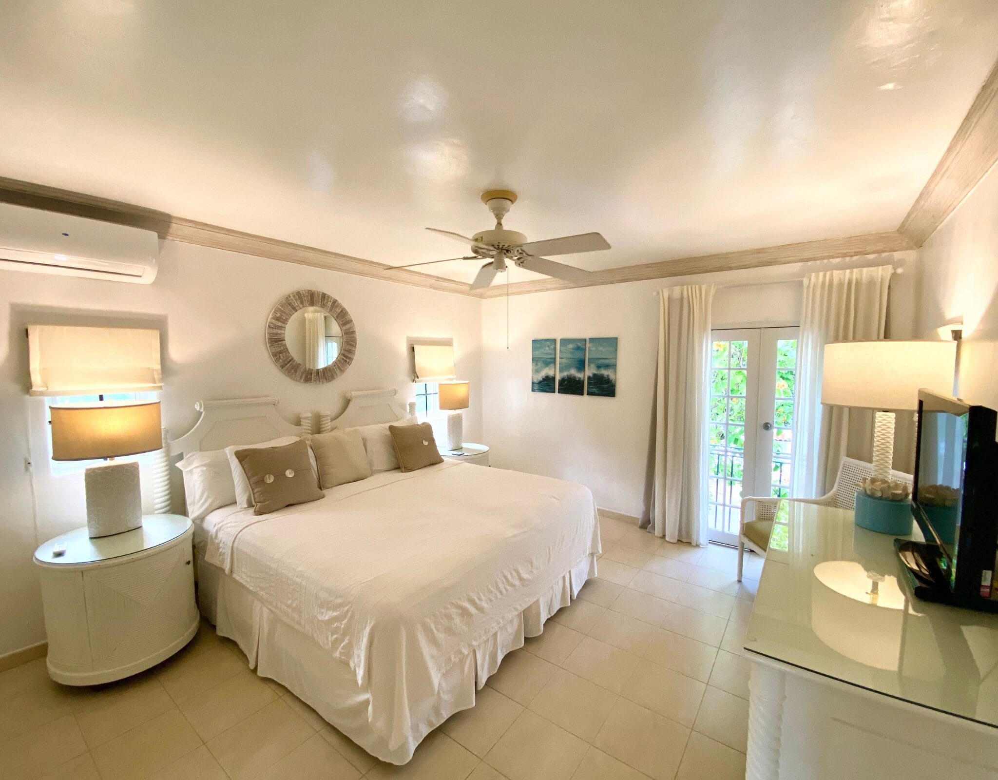 The master bedroom features a king bed and enjoys direct access to the balcony, allowing fresh air and natural light to fill the room. It includes air conditioning, a ceiling fan, and a television with internet channels, along with an ensuite bathroom finished with a rain shower and granite vanity. The second bedroom can be arranged as twin beds or converted into a king, offering flexibility for different guest needs. This room is also air conditioned, includes a ceiling fan, and has French doors that open into the living space. A second bathroom is conveniently located off the hallway and features a combined shower and tub with a granite vanity.