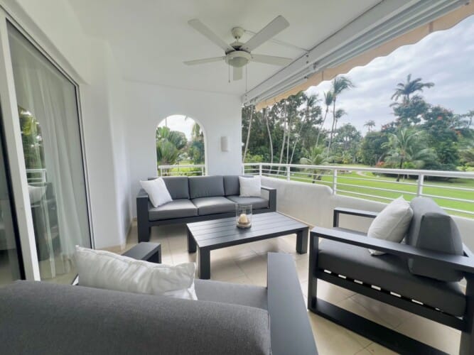 Inside, the apartment is bright and comfortably furnished, with an open plan living, dining, and kitchen area designed for effortless holiday living. The kitchen is fully equipped with modern appliances, making it easy to prepare anything from a simple breakfast to a relaxed evening meal. The living area is air conditioned and fitted with ceiling fans, and opens directly onto a generous double balcony. With ceiling fans and outdoor seating, this space is perfect for al fresco dining, morning coffee, or unwinding in the evening while enjoying the garden views and gentle island breezes.