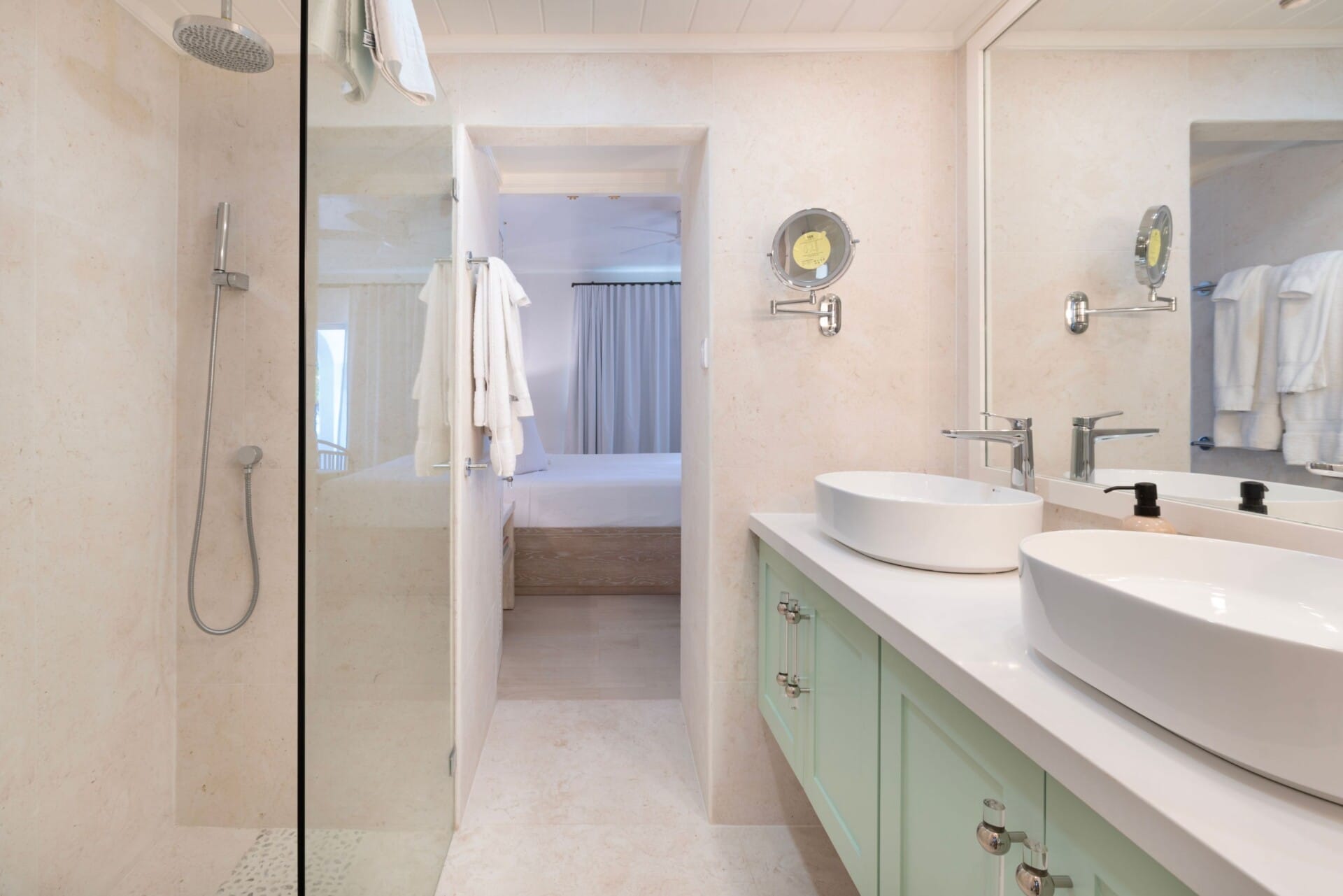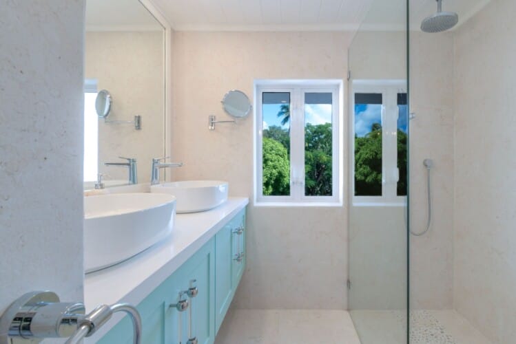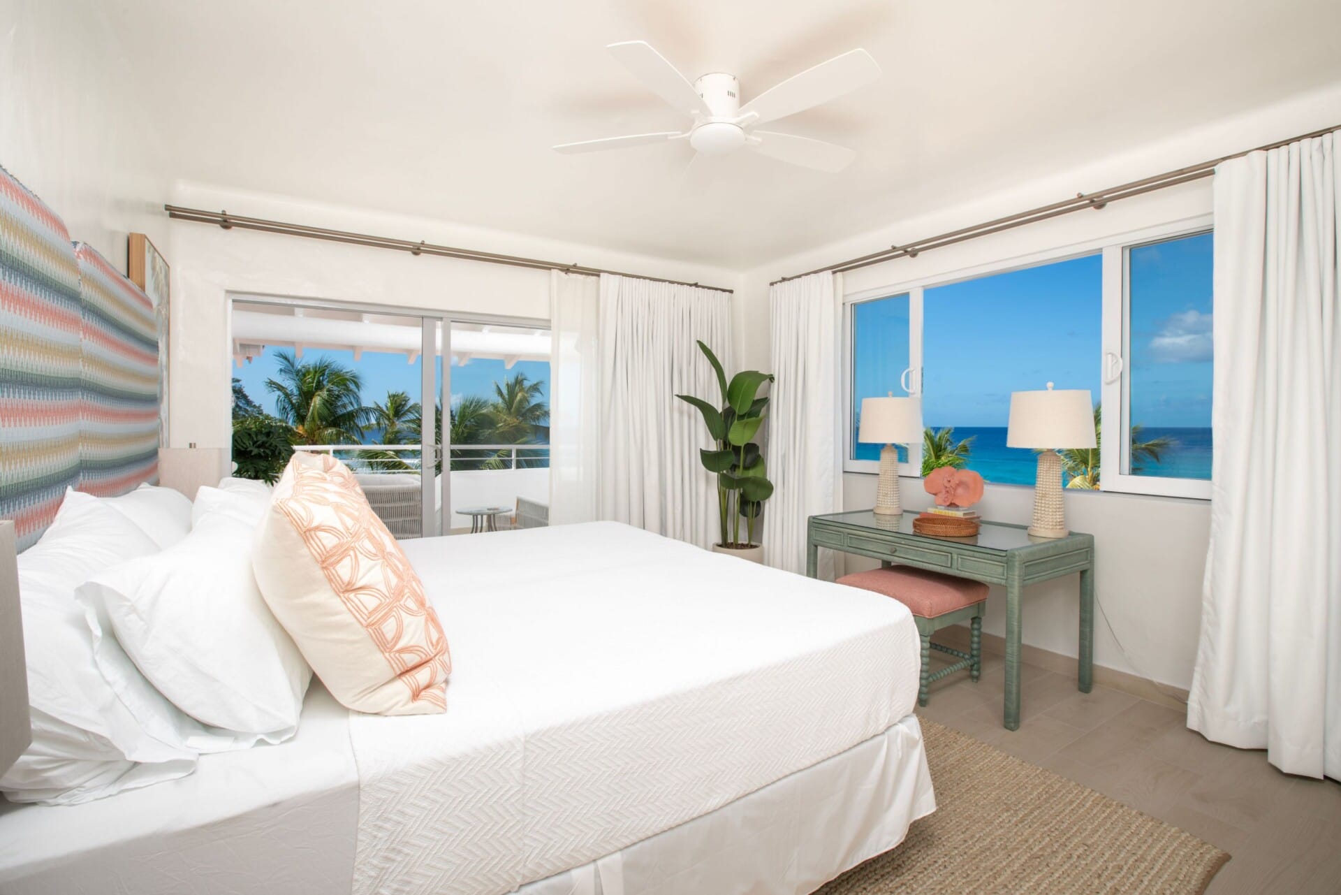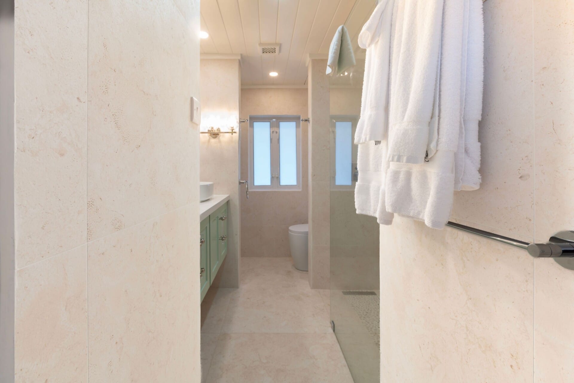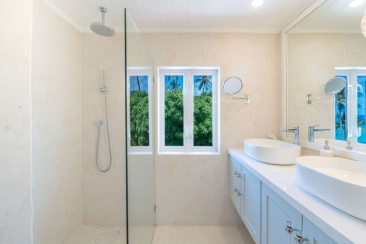 The upper floor holds the remaining two bedrooms. Each has air conditioning, ceiling fans, private balconies and king beds that can be separated into twins if needed. Both bedrooms have their own ensuite bathrooms with rain showers and granite vanities.