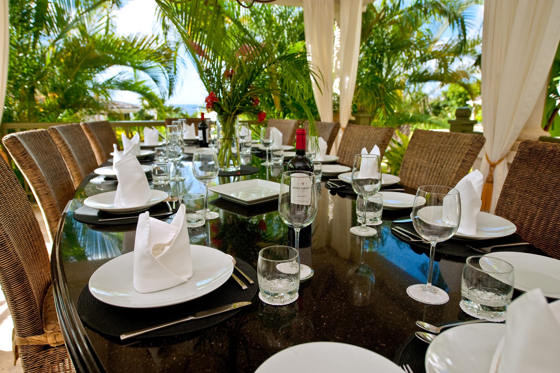 Go Easy is one of the few private homes in Sugar Hill with its own private tennis court and charming gazebo—an exclusive perk for active guests who appreciate convenience and luxury. The villa’s formal dining patio, set beneath ambient lighting and nestled in tropical greenery, creates an atmosphere of effortless elegance.