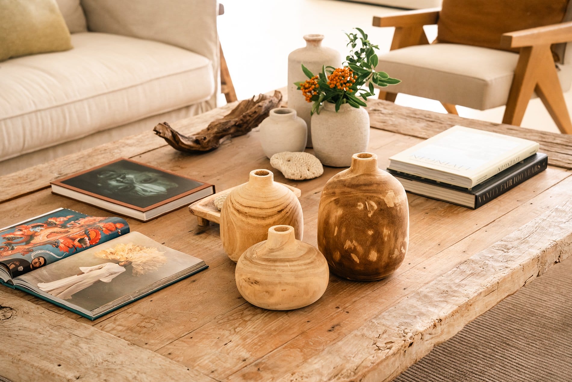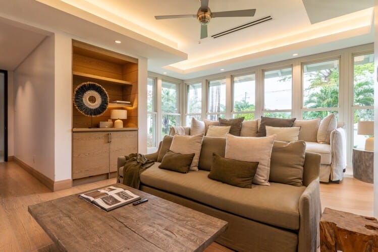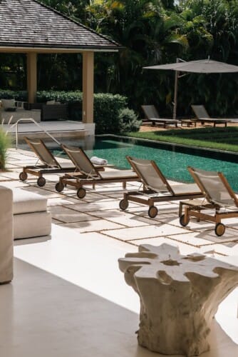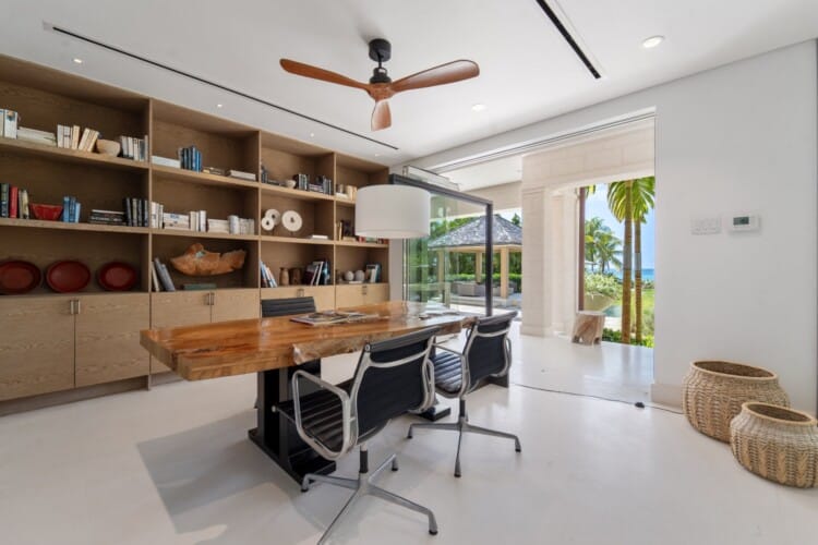 The villa’s open-plan living area is bathed in natural light and offers stunning sea and pool views through large windows. Furnished with designer pieces, including Maxalto, Christian Liaigre, and Ralph Lauren, it provides an inviting space for relaxation. The fully equipped Boffi kitchen with a wall-mounted TV and a large breakfast table offers multiple dining options, whether indoors around the bespoke Whetstone Oak dining table or outdoors in one of the two shaded dining areas.