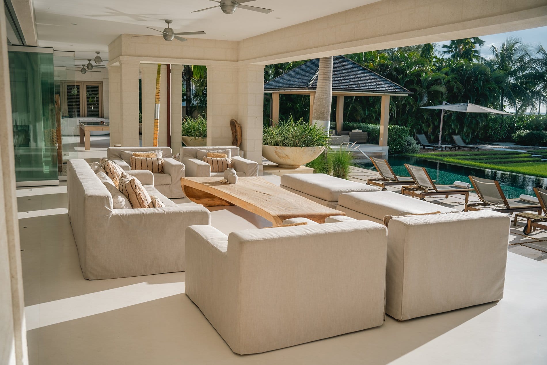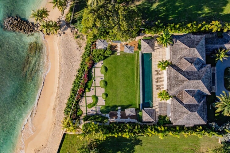 Surrounded by approximately 1.2 acres of landscaped gardens, the villa features two shaded dining areas, a yoga pavilion, and a herb and Caribbean spice garden for fresh ingredients. A 25-meter mosaic-lined pool is perfect for laps, while sun loungers provide relaxation by the poolside. A pebbled path leads directly to a protected beach where you may witness newly hatched turtles making their way to the sea.