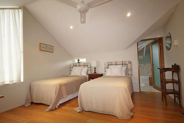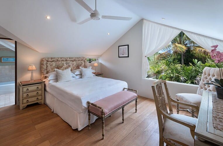 A mahogany and glass staircase leads upstairs to a bridge connecting two further bedrooms. One is a double and the other a twin, both with en suite bathrooms and uninterrupted ocean views, making them ideal for guests who appreciate privacy and scenery.