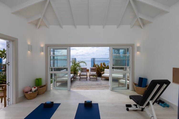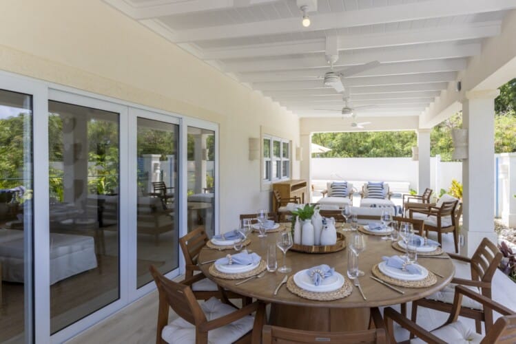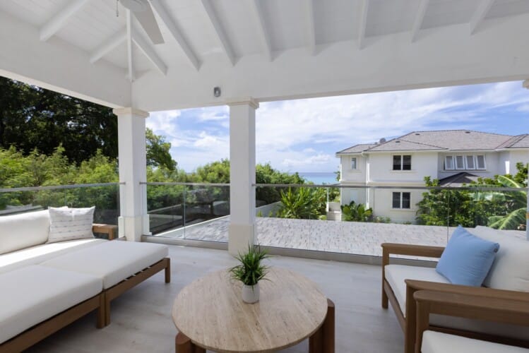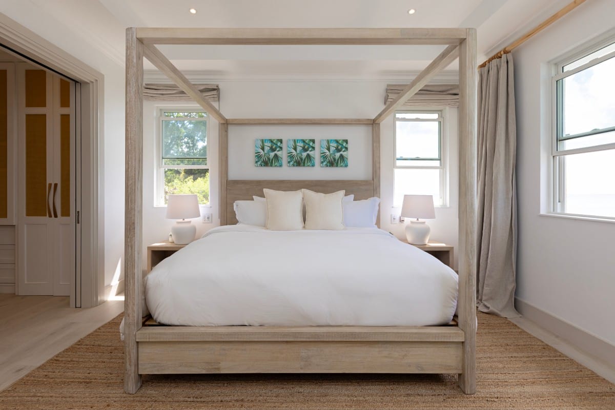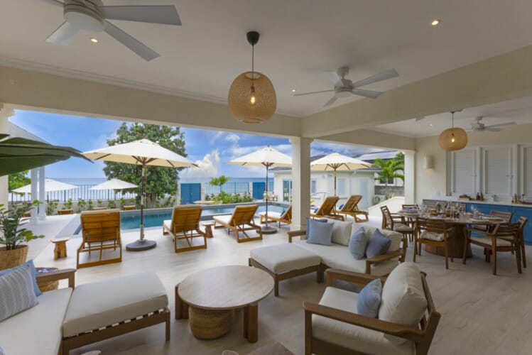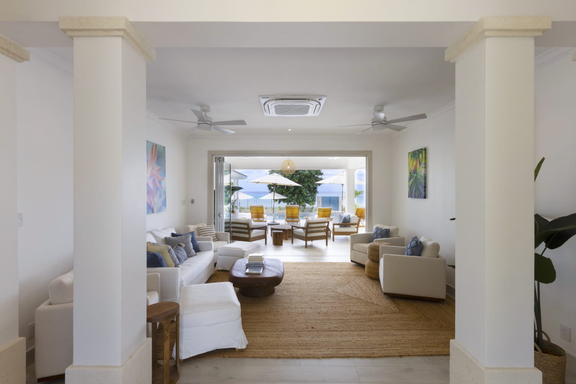 Kaiso is the heart of the estate and sits directly on the sand, offering four en suite bedrooms and uninterrupted views of the Caribbean Sea. The villa is designed for easy indoor outdoor living, with light filled living and dining spaces flowing onto a private pool deck overlooking the ocean. Three bedrooms are located upstairs, while a ground floor suite provides convenient access for guests who prefer fewer stairs. Outdoor living is a highlight, with a private swimming pool and integrated jacuzzi, shaded lounging areas, and a beachfront gazebo that comfortably hosts long lunches and evening gatherings. Steps from the terrace lead straight onto the beach, making it easy to move between pool, sea, and sun throughout the day.