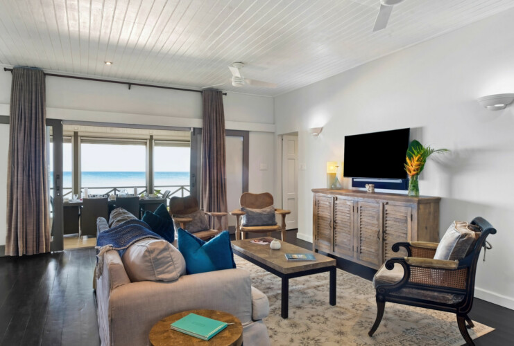 The great room features an open-plan layout, adorned with an oversized linen couch and antique Barbadian chairs, complemented by a modern and well-appointed kitchen. The master suite boasts a super king-size bed, an expansive closet, and an en-suite bathroom with a rain shower and marble-beach glass tiles. The second bedroom offers flexibility with either two single beds or a king-size option, accompanied by a cozy bathroom featuring a claw foot tub and shower.