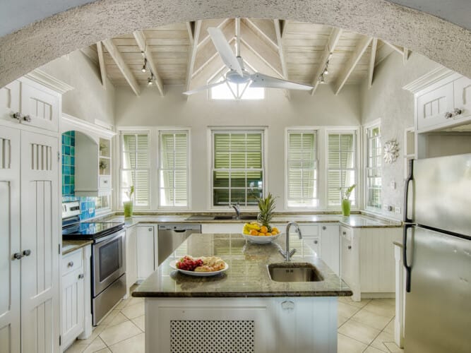 Upstairs, four airy en suite bedrooms have air conditioning and ceiling fans. The master suite features a king bed and an oversized tub, perfect for unwinding after a day in the sun, while the additional bedrooms can be configured as twins or kings for flexibility. A charming dining room with hardwood floors and colonial-style furnishings opens to dazzling sea views, and the fully equipped kitchen makes intimate breakfasts or family meals easy.