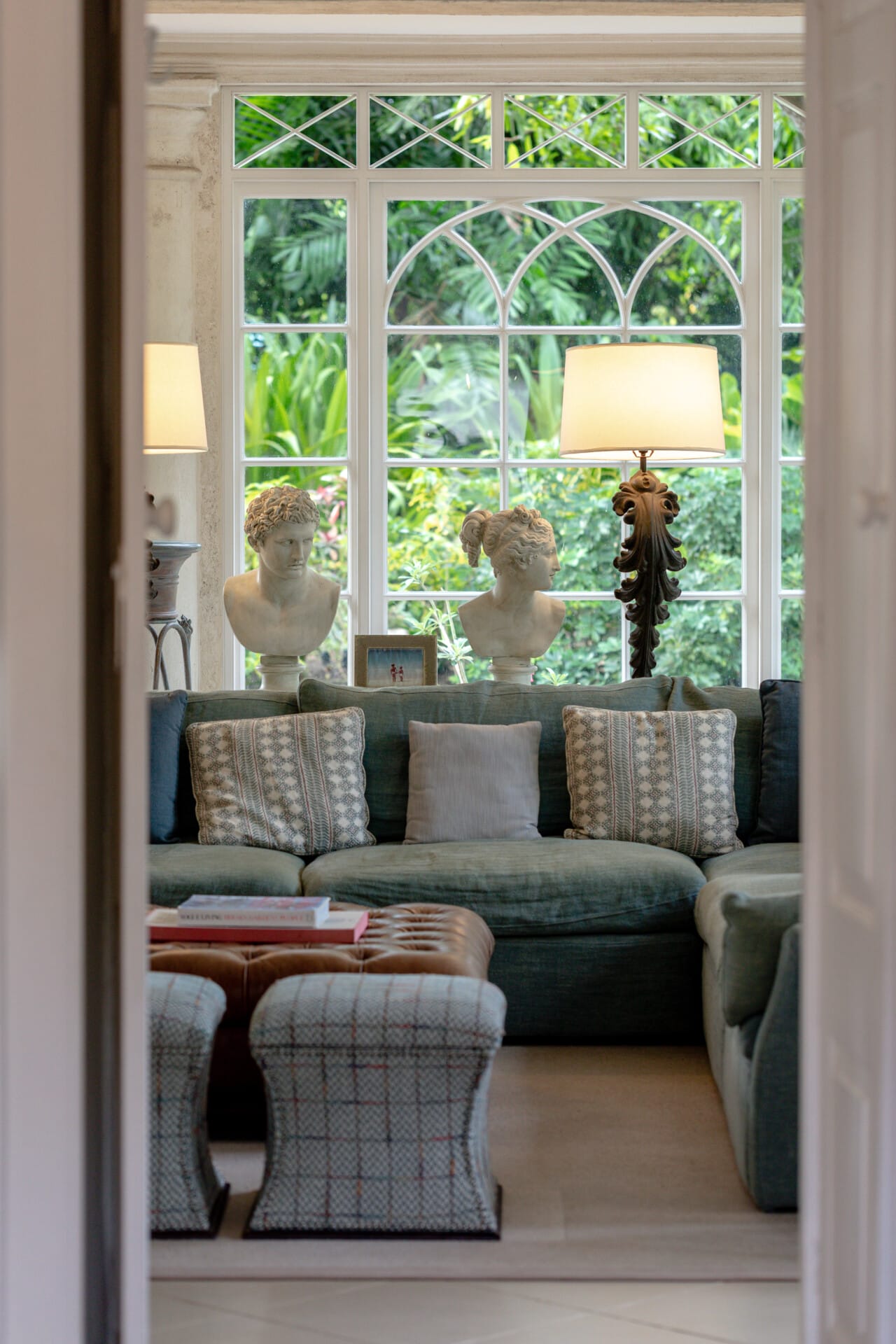 Inside, seven en-suite bedrooms are thoughtfully spread across the Main House and two guest cottages, offering both luxury and privacy for up to 14 guests. The master suite is a standout, with antique furnishings, vaulted ceilings, and a private balcony overlooking the sea. High-end finishes, marble floors, and bespoke décor elevate the interiors, which also include a refined living area, entertainment lounge, and dedicated home office.