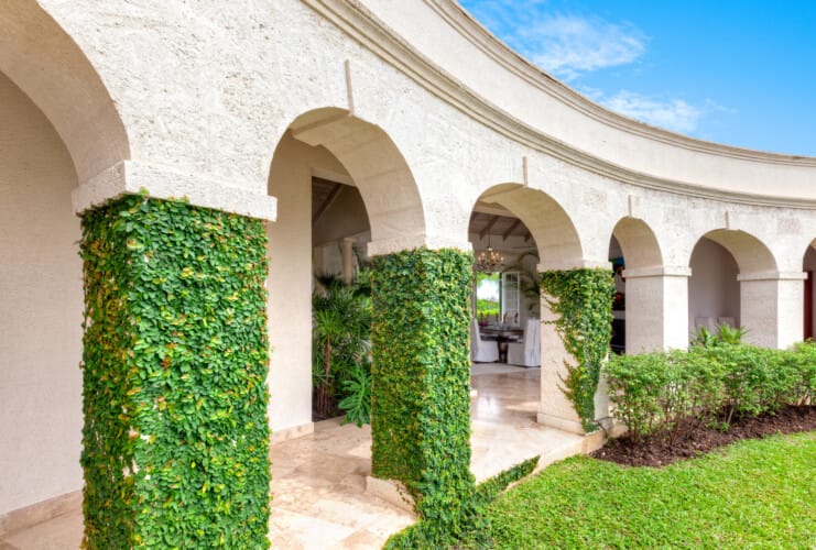 Inspired by classical Italian design, ivy-covered arches and stone-clad columns frame the villa’s open-air layout, where nature and architecture blend seamlessly. The central open-plan living area flows effortlessly out to lush gardens, a tranquil fountain, and a sleek infinity-edge pool that appears to melt into the ocean horizon. It’s the perfect vantage point for sunset cocktails or peaceful afternoons beneath the sun.
