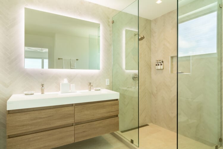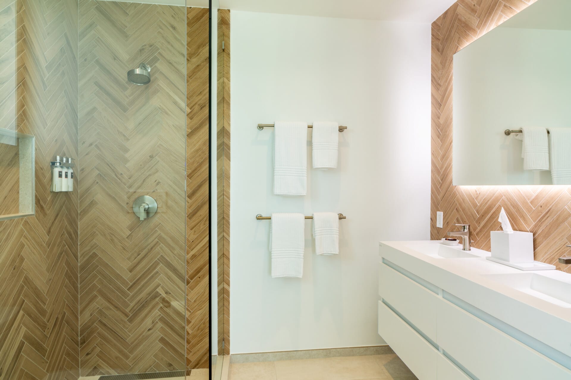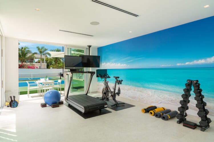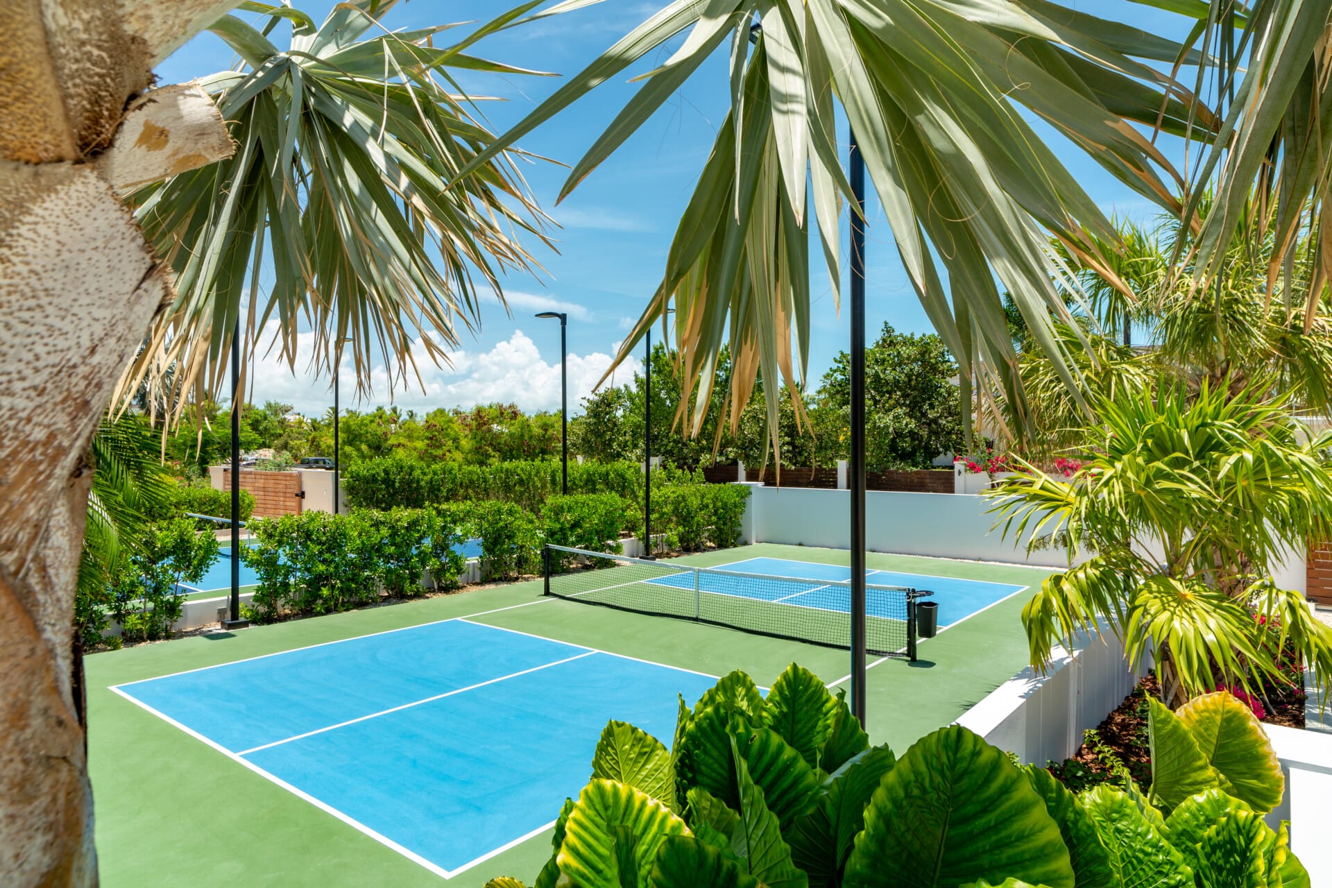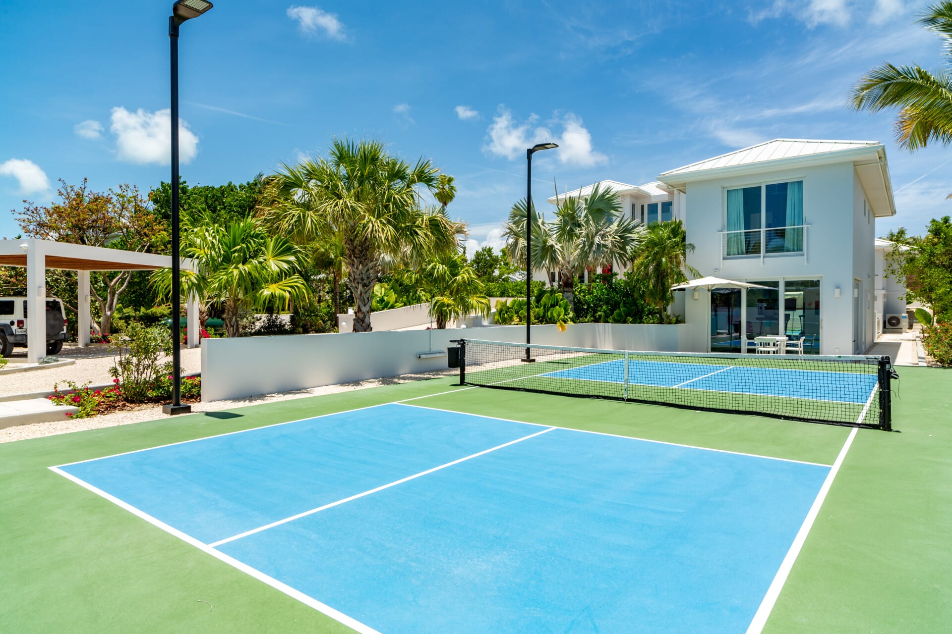 Wellbeing and play are woven into the experience. A full gym with Peloton bike and treadmill sits alongside a private massage room with its own bathroom, while a regulation size lighted pickleball court adds a lively social element to afternoons. Kayaks, paddleboards, snorkelling equipment and bicycles encourage easy exploration of both sea and shore, while a fire pit with seating on the beach provides a memorable setting as the sun dips below the horizon and the shoreline glows with soft lighting.
