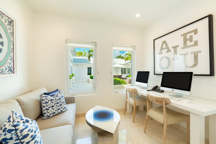 The house unfolds generously across the main residence and a separate guest cottage, allowing families and groups to come together while still enjoying space and privacy. Six bedrooms are set within the main house across both ground and upper levels, complemented by two further bedrooms in the guest cottage, including a children’s room designed for easy family living. Interiors feel light, contemporary and welcoming, with thoughtful details throughout, from ocean facing family television spaces upstairs to a dedicated office with desktop computers for those who need to stay lightly connected.