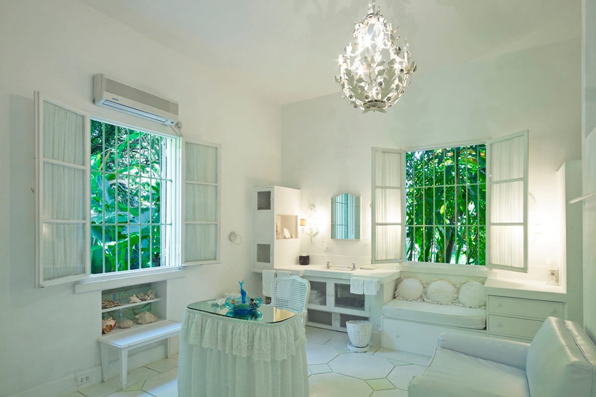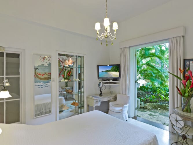 At the heart of the property stands an exquisitely restored coral stone villa dating back to the eighteenth century. The main house blends historic charm with modern comfort, offering five beautifully appointed bedrooms filled with natural light and gentle sea breezes. Each room looks out over lush tropical gardens or the shimmering Caribbean Sea, creating restful spaces that feel both elegant and welcoming. Crisp white interiors provide a serene backdrop, accented by carefully chosen antiques and unique pieces that reflect the home’s heritage.