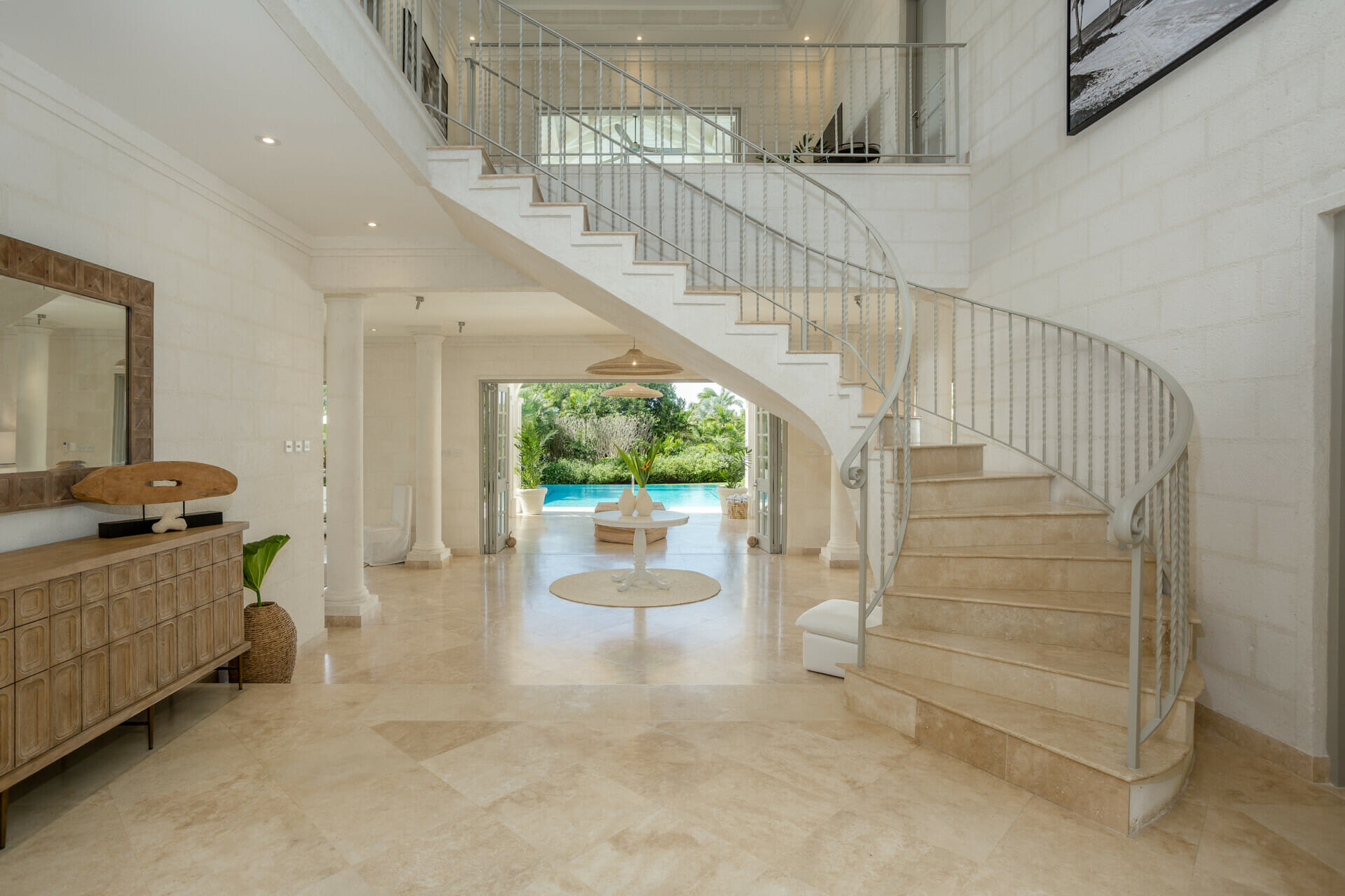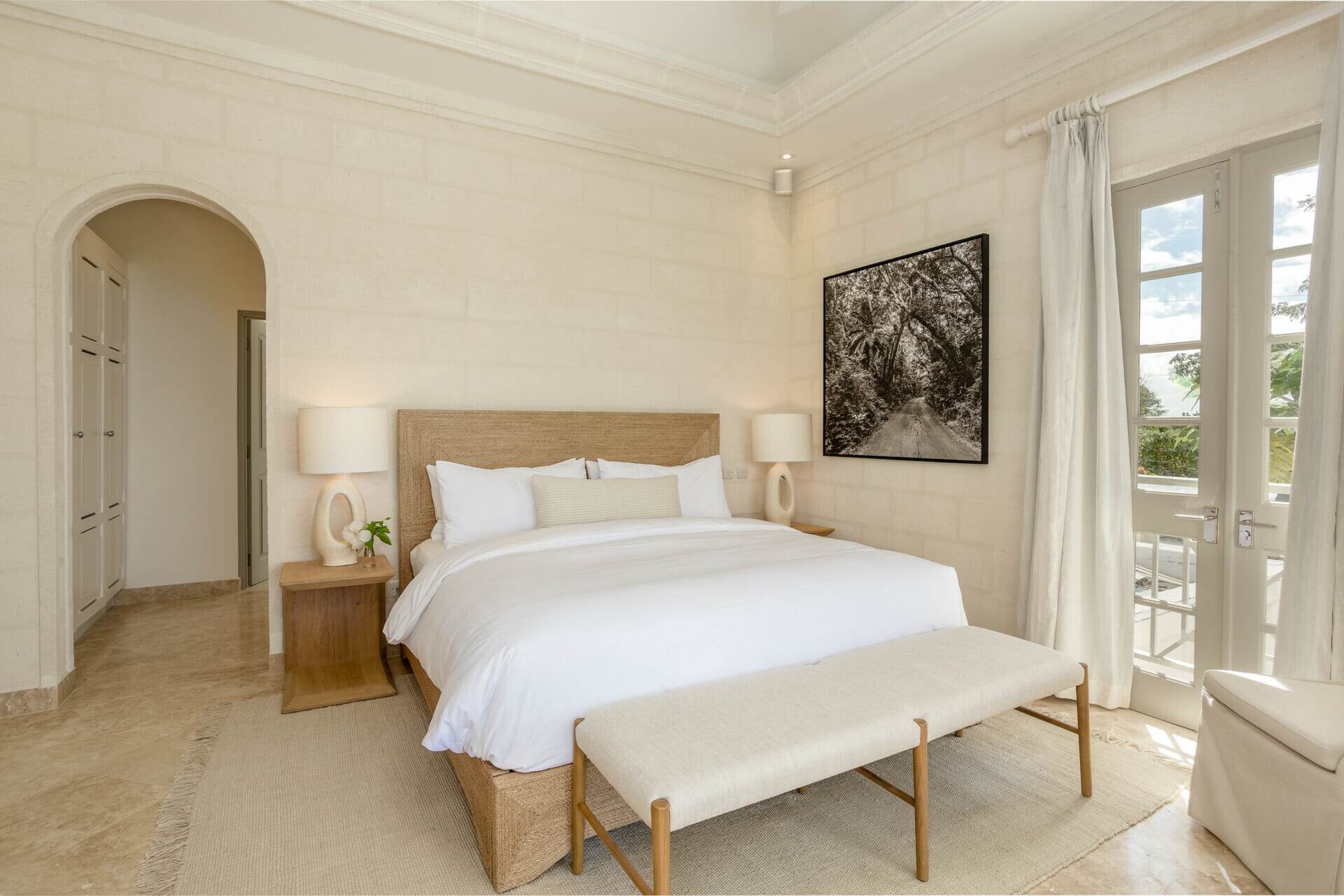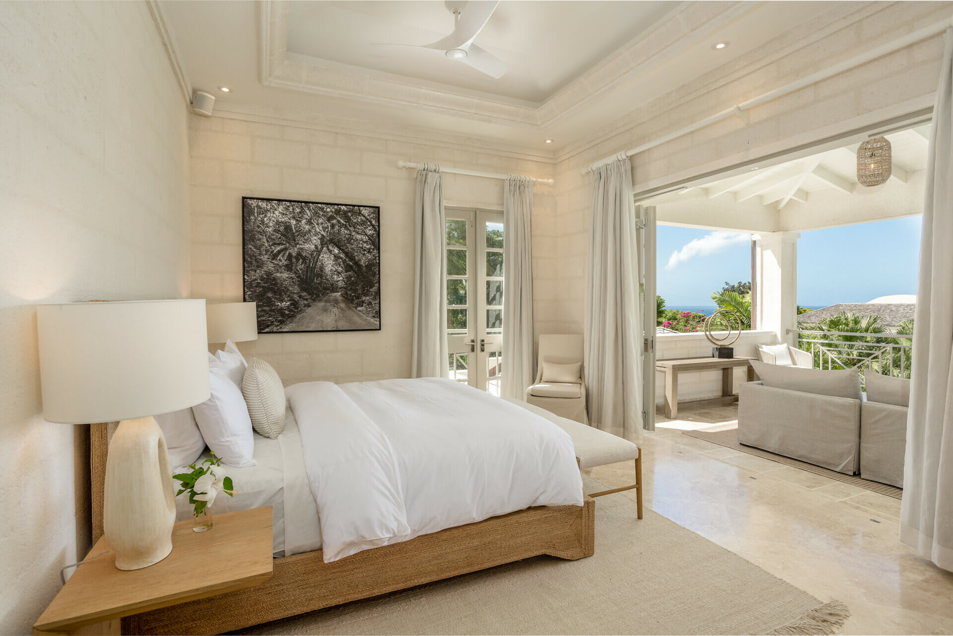 This contemporary five bedroom villa is set within a prestigious gated community on Barbados’ West Coast, offering a refined and private setting for a relaxed island escape. Each bedroom features a king bed and its own en suite bathroom, creating a comfortable retreat for couples, families, or groups travelling together. Two spacious primary suites occupy the upper level, opening onto large terraces with sweeping views of the Caribbean Sea and the surrounding tropical landscape, while a further en suite bedroom on the main floor provides convenience and privacy.
