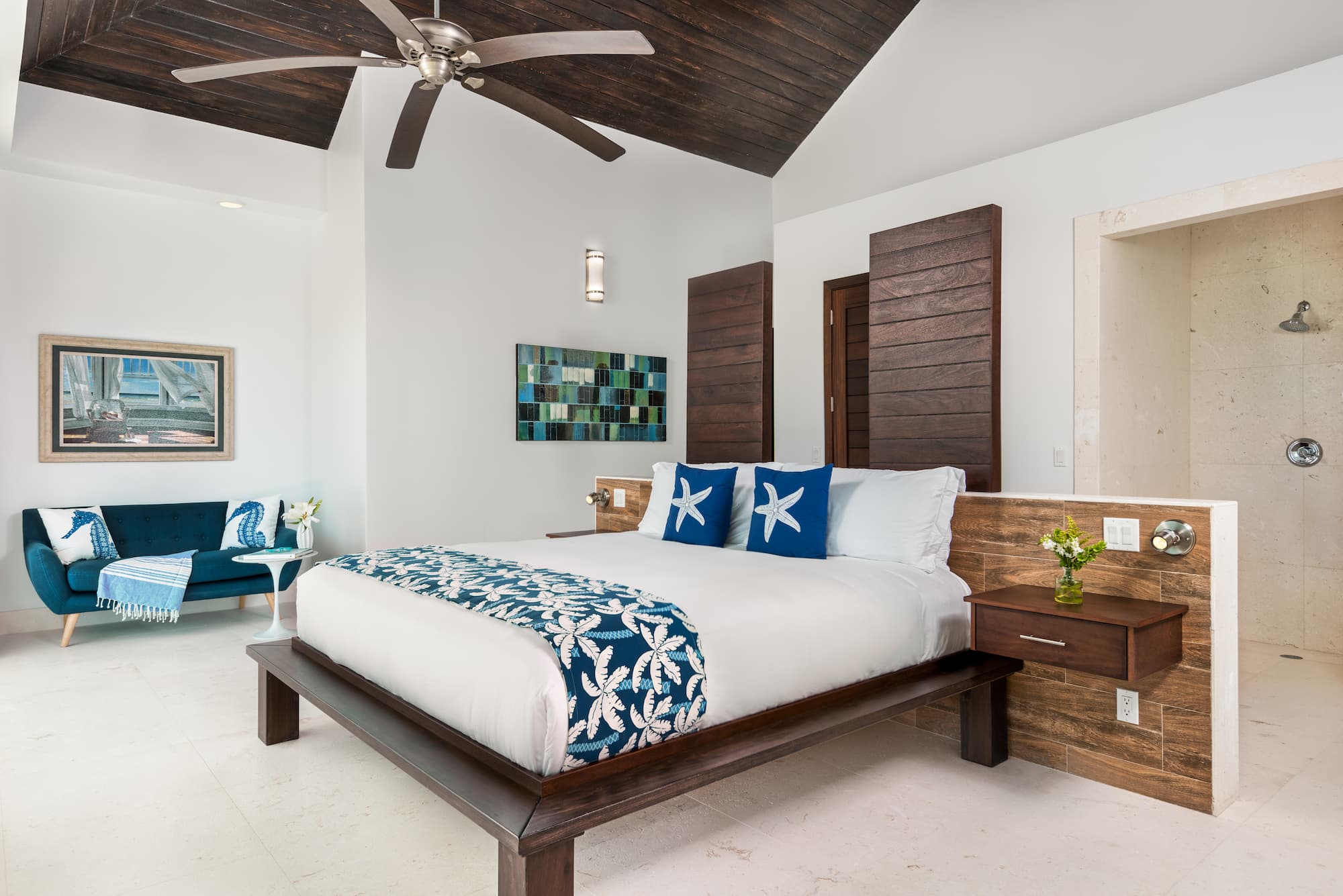 Thoughtfully designed for both style and ease, the villa’s interiors feature clean lines, airy spaces, and a seamless indoor-outdoor flow. The open-plan living area and fully equipped kitchen extend through retractable glass doors onto the pool terrace, creating a bright, welcoming space to relax and entertain. Three well-appointed king suites provide a restful retreat after sun-filled days, with one located on the main level and two upstairs. Each upper-level suite enjoys a private balcony, one overlooking the endless horizon, the other offering views across the marina and its gently bobbing boats.