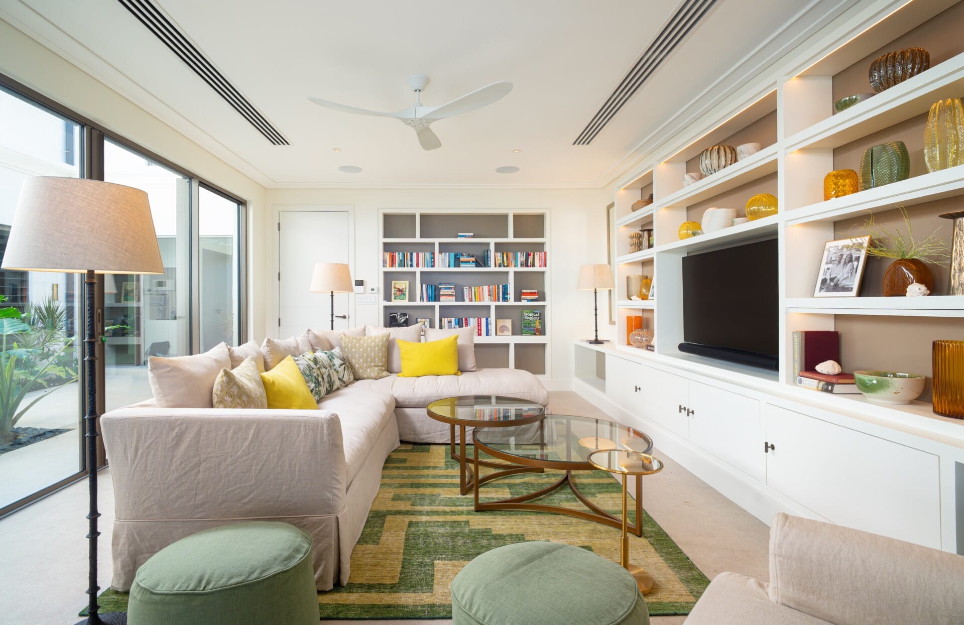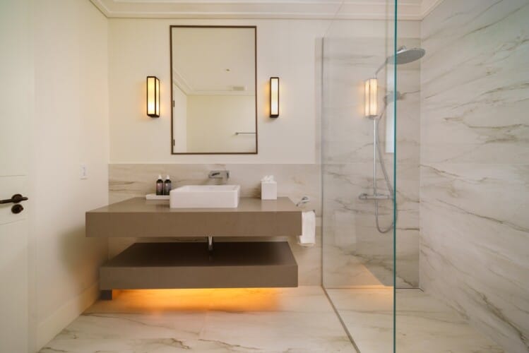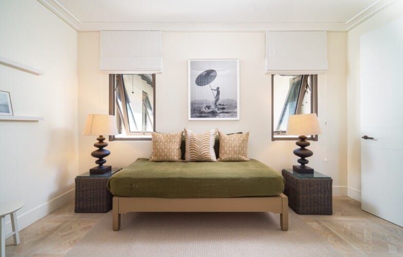 The sleek modern kitchen, complete with a chef’s preparation area, connects seamlessly to the dining room and the TV lounge, with sliding glass doors that open onto a wide terrace and the private pool deck beyond. At the centre of the villa a tranquil courtyard with gently flowing fountains and lush foliage encourages effortless indoor outdoor living, filling the home with light and a refreshing breeze. Outside shaded lounges and al fresco dining areas overlook the artfully designed infinity pool and a beautiful stretch of beach, a rare privilege even on the West Coast.