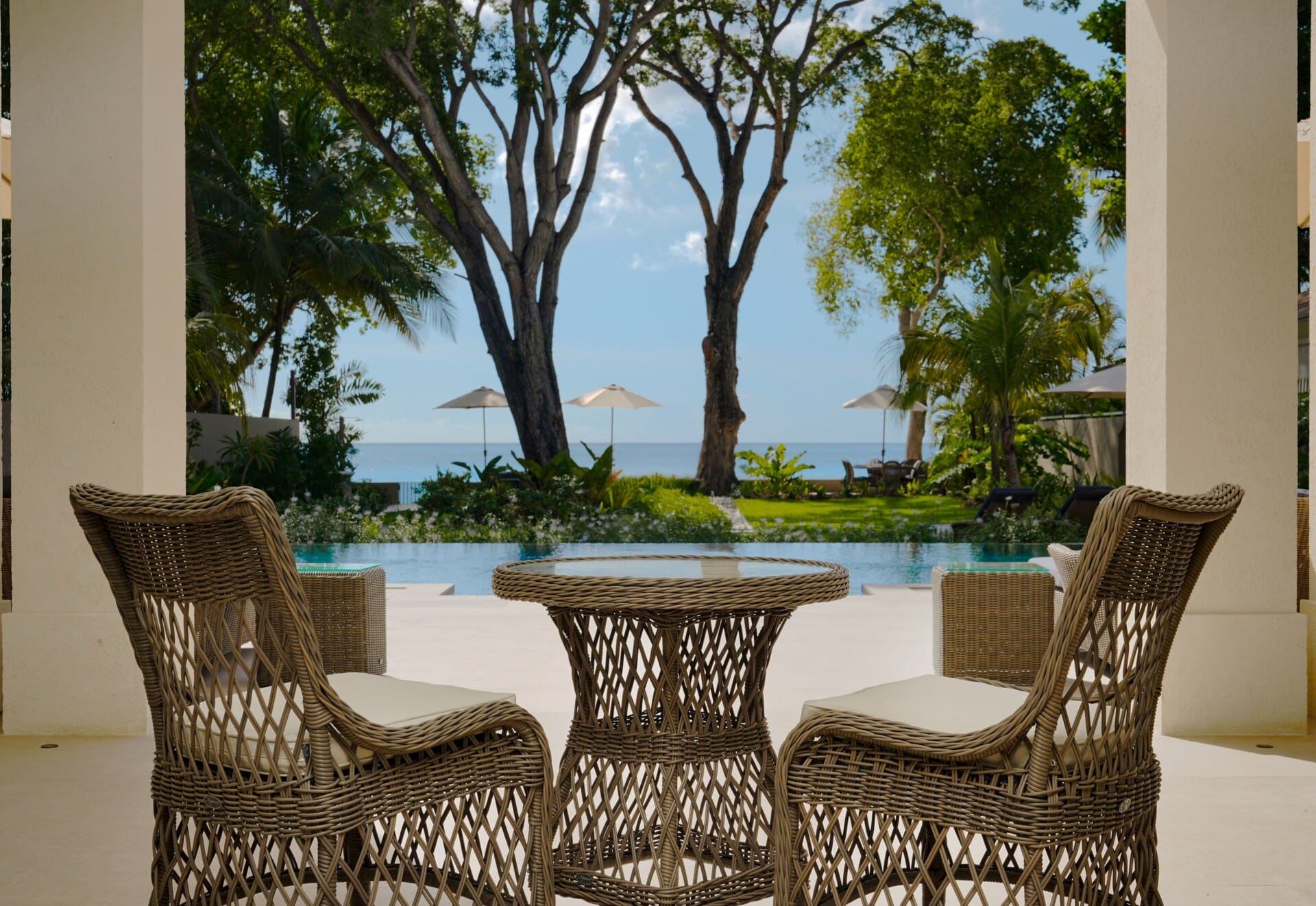 Upstairs the villa offers three spacious air conditioned bedroom suites that open onto private balconies overlooking the turquoise Caribbean Sea, providing idyllic spots for peaceful mornings with coffee or tranquil evenings with sunset drinks. The main suite includes an adjoining snug with views of the infinity pool, perfect for quiet reading or working with a view, while a second snug nearby offers a flexible space for relaxed downtime. Downstairs two additional air conditioned bedrooms lead onto private verandas surrounded by tropical greenery, creating personal retreats within the estate while keeping everyone connected to the heart of the home.