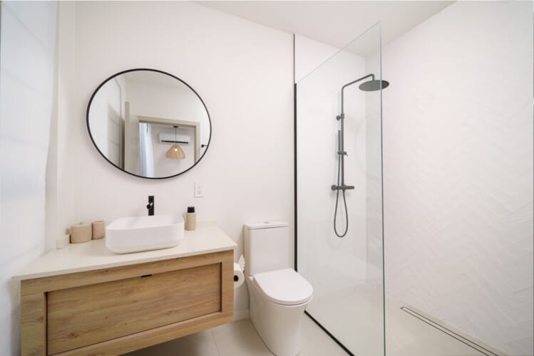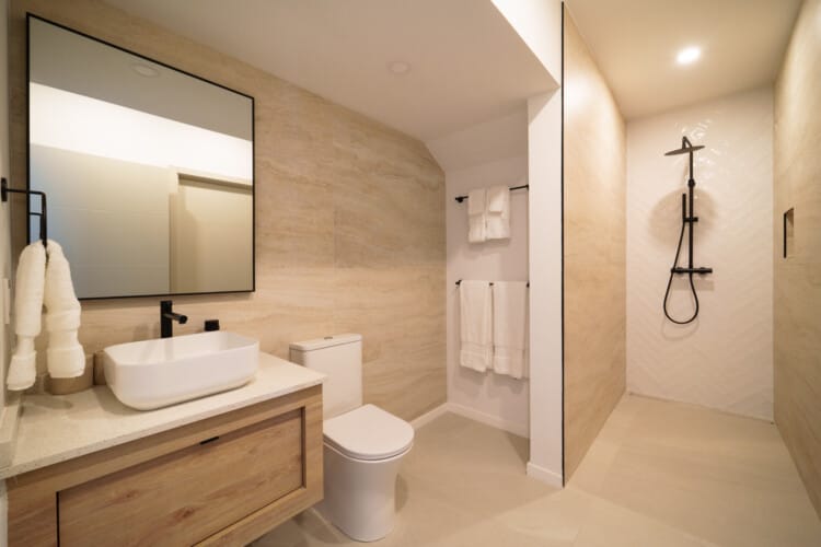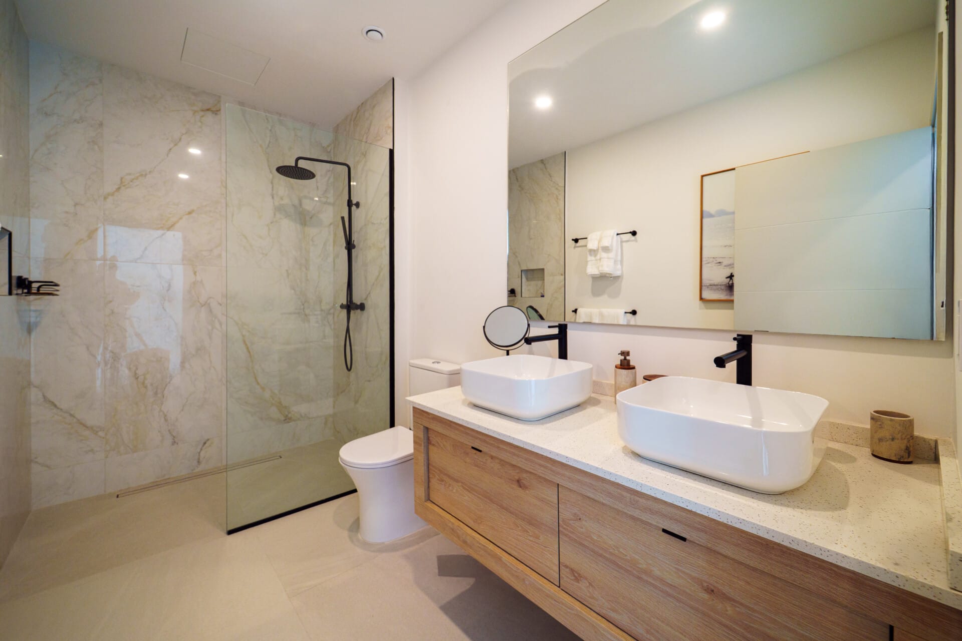 Each of the three ensuite bedrooms has been designed with privacy and comfort in mind. Two are located upstairs, while the third sits conveniently on the ground floor, perfect for guests who prefer to avoid stairs. The master suite features a king-size bed and opens onto a private terrace with a freestanding outdoor tub, an indulgent spot to unwind under the stars. The remaining bedrooms, each with queen beds, are tranquil sanctuaries with understated style and contemporary finishes. Bathrooms are fresh, elegant, and thoughtfully appointed for both function and relaxation.