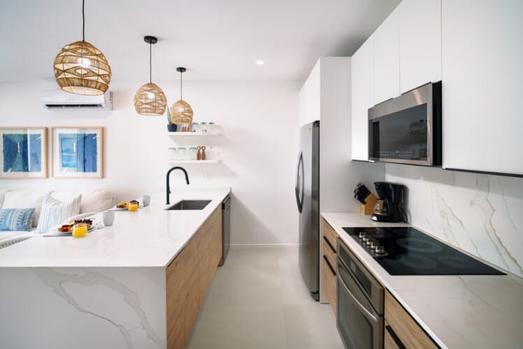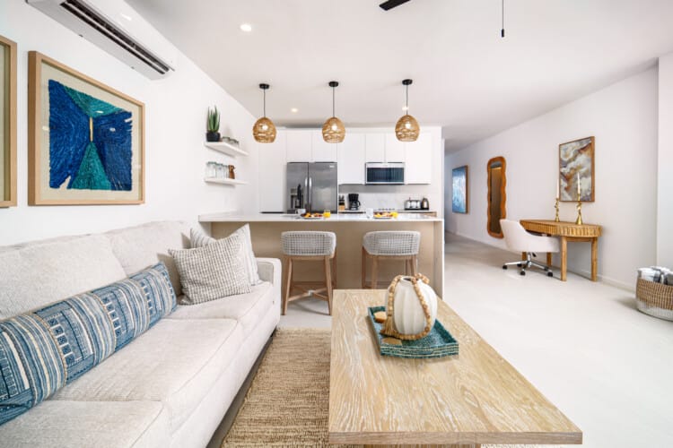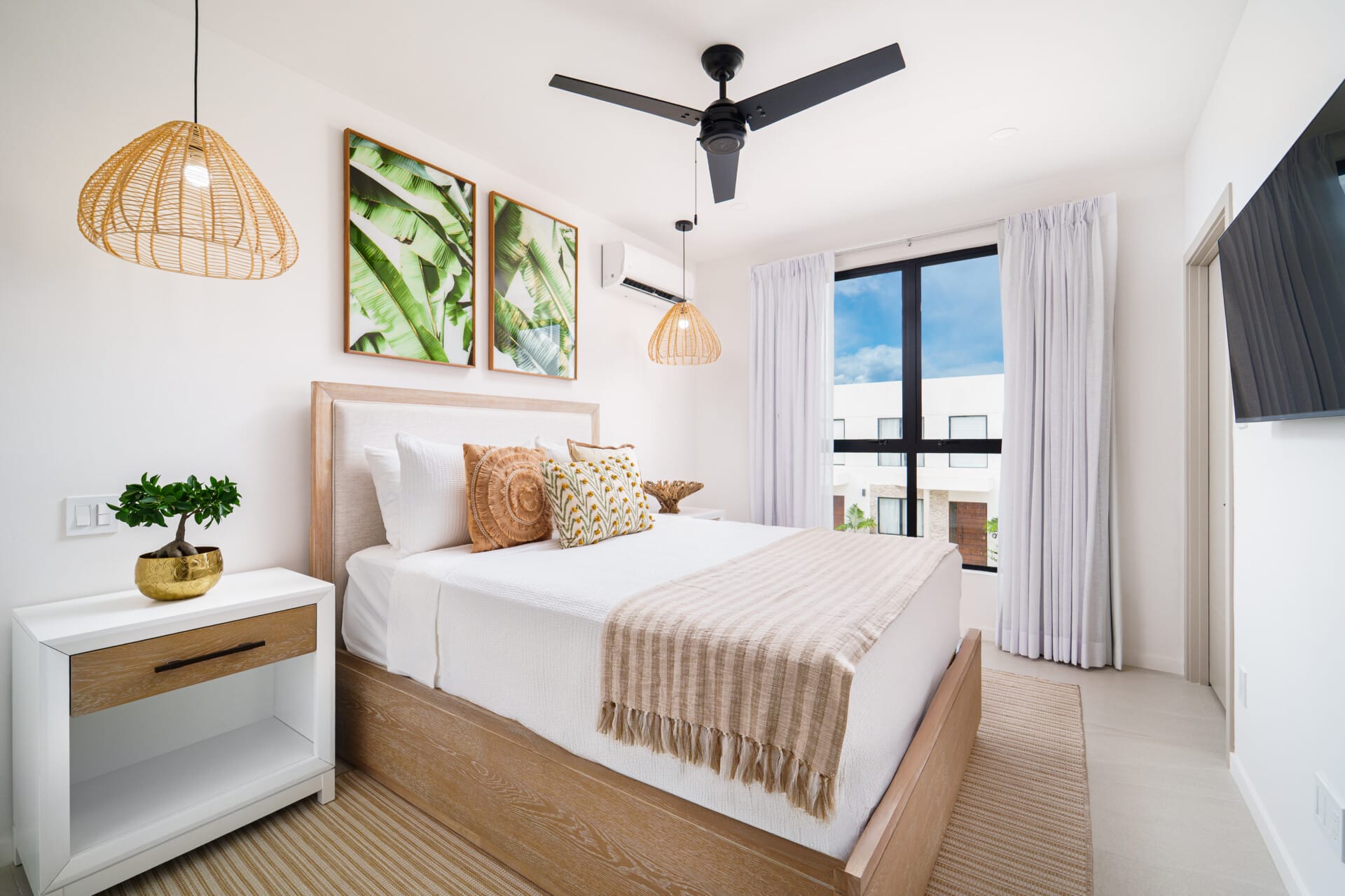 At the heart of the villa lies a bright open-plan living space where the kitchen, dining, and lounge areas flow effortlessly together. The sleek kitchen, complete with a stylish island and bar seating, is ideal for casual breakfasts or evening cocktails. Large glass doors open out to the patio, allowing the gentle Caribbean breeze to fill the space and blurring the lines between indoor and outdoor living. Clean lines, soft neutral tones, and subtle textures bring a sense of serenity throughout the home.