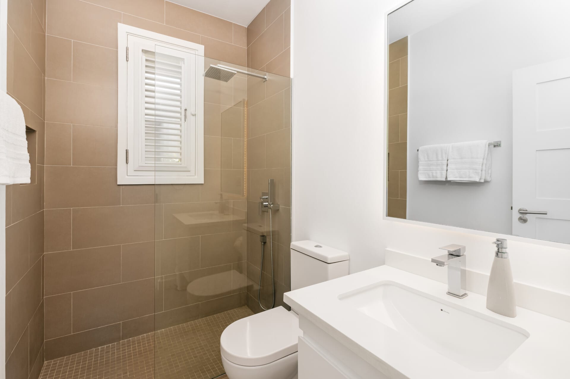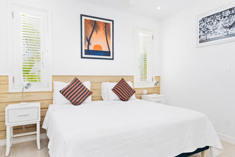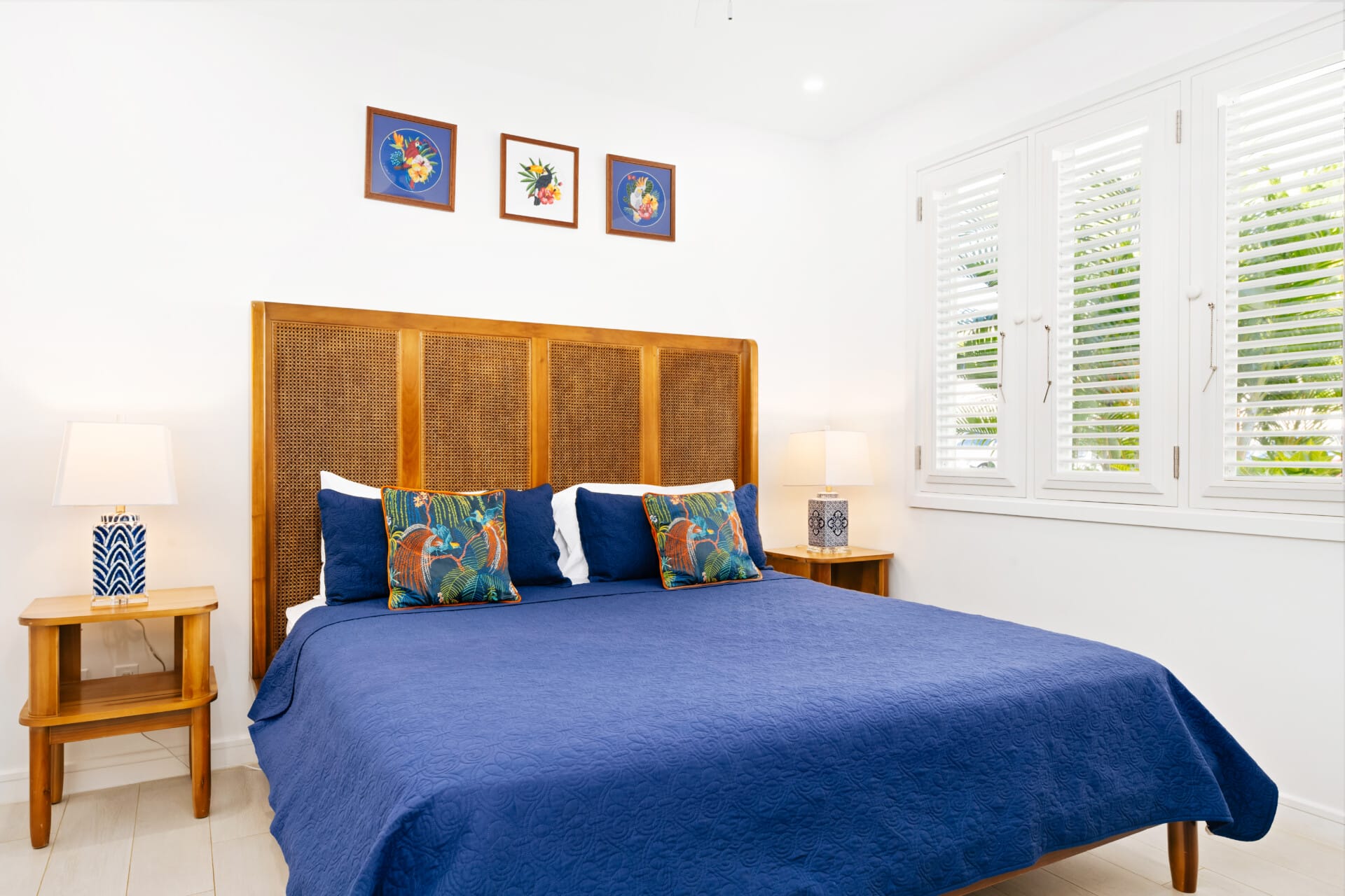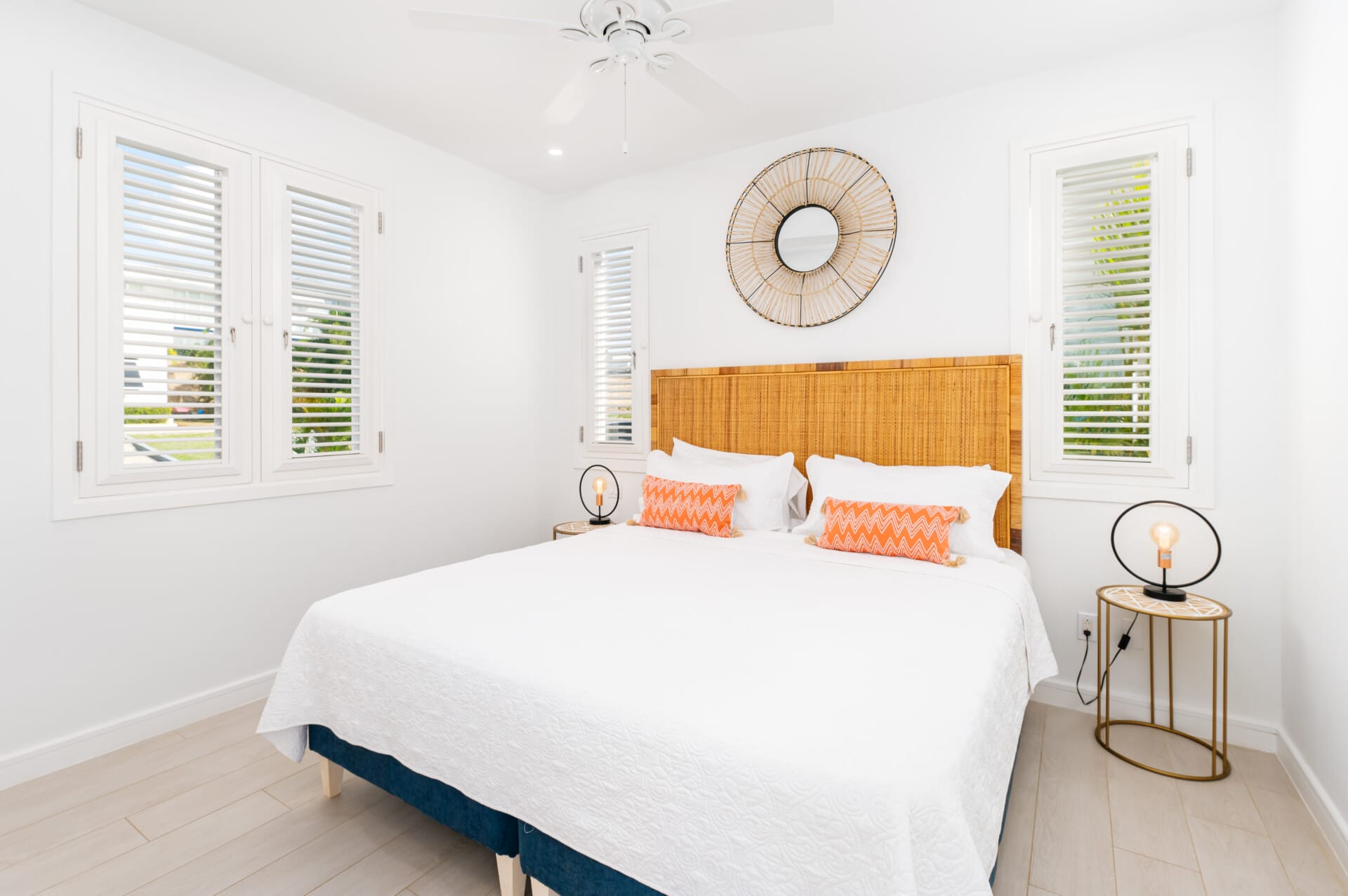 Designed for families and couples alike, the villa features three air-conditioned bedrooms. The master suite includes a king bed and dedicated workspace, while the second bedroom has a queen bed and the third offers twin beds convertible to a king; ideal for flexibility. Each space is designed with cool, crisp interiors accented by vibrant local artwork and custom furnishings.