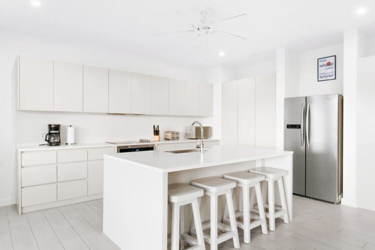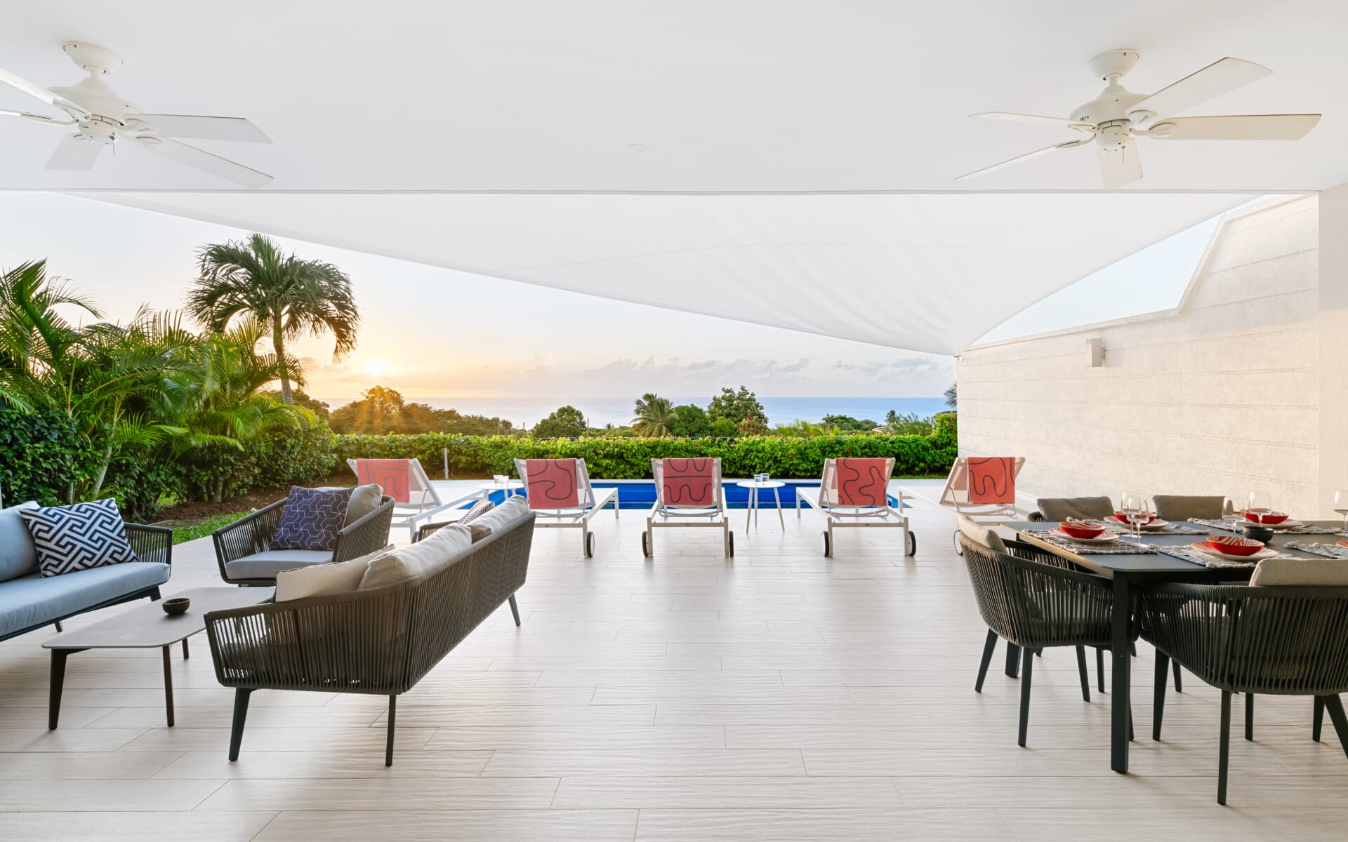 The heart of Whitehaven is its seamless indoor-outdoor living. The open-plan living area spills effortlessly through bi-fold doors onto the covered patio, where an alfresco dining area, chic lounge seating, and a sun deck frame the villa’s private 20ft saltwater pool. From here, guests can soak up panoramic ocean views by day and spectacular sunsets by night.