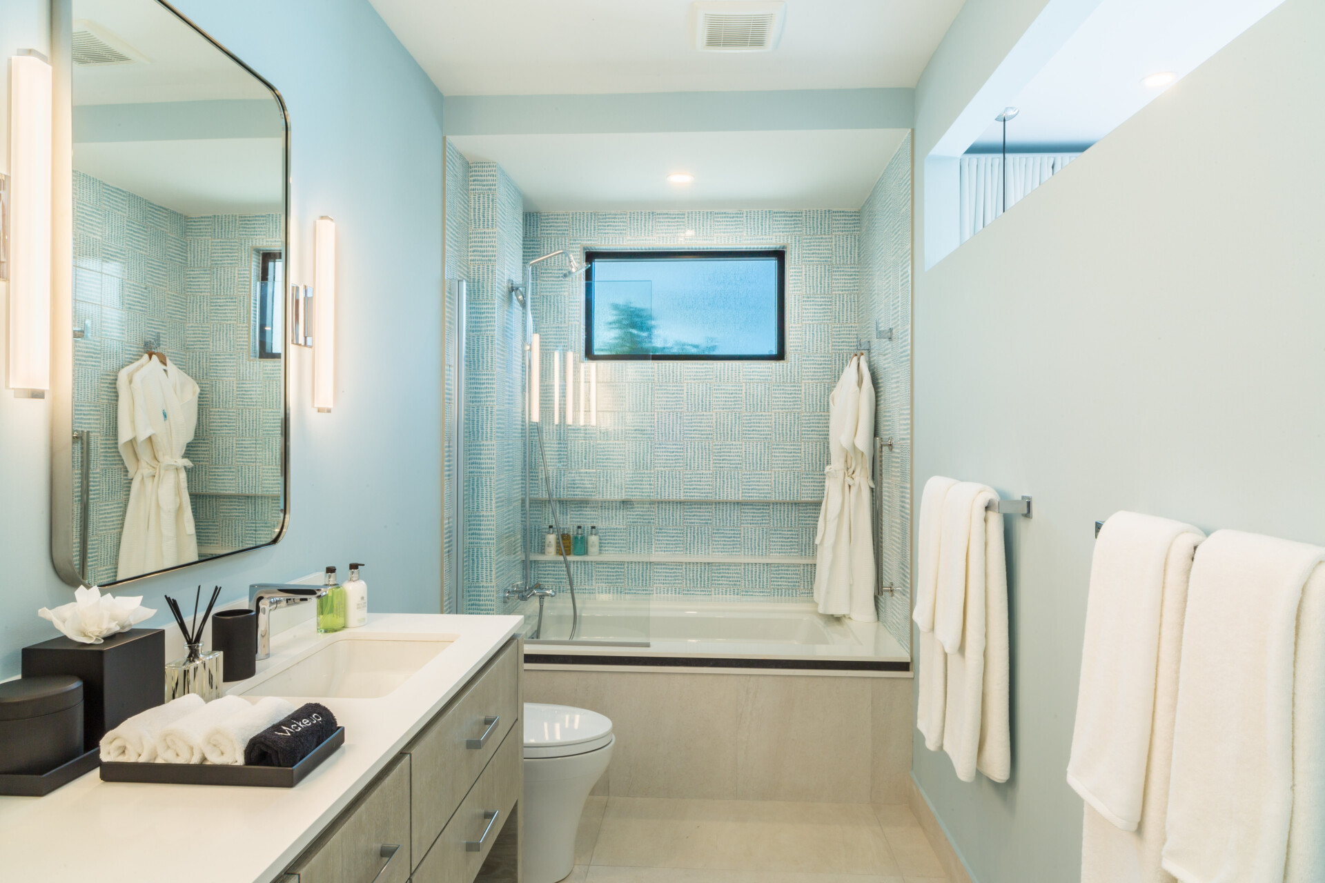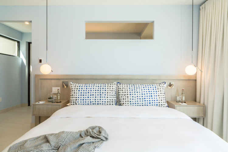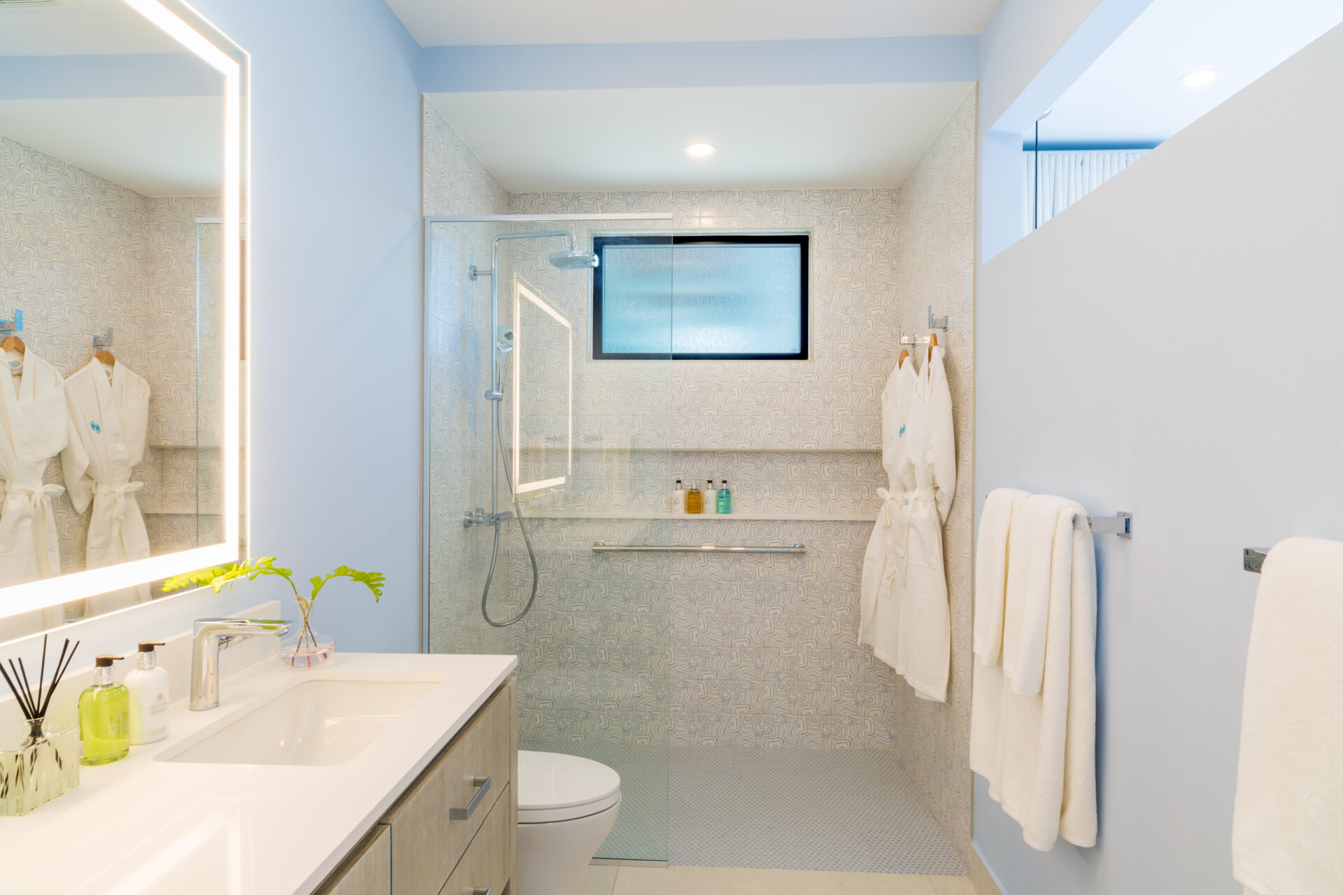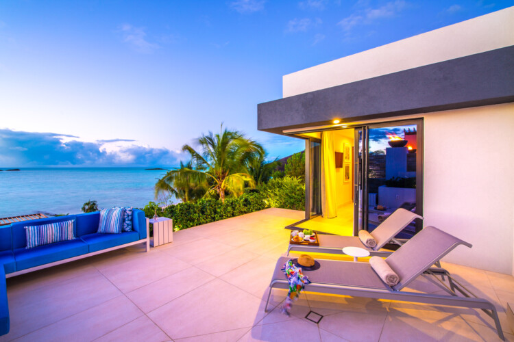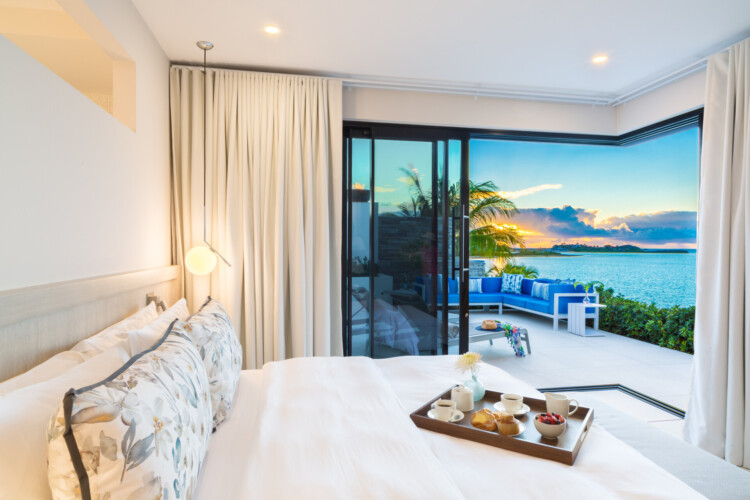 Each of the four bedrooms features its own ensuite bathroom and captivating ocean outlook. The principal suite on the second level is a true highlight, with floor to ceiling windows framing 120 degree views across the Caribbean. A private patio with seating and chaise lounge provides a secluded spot for sunrise breakfasts, while inside, the bathroom feels like a private spa with dual vanities, an egg shaped bathtub filled by a ceiling waterfall, indoor and outdoor showers and refined Hansgrohe fittings. On the first level, two further king bedrooms open through sliding glass doors to private patios and terraces, offering immersive sea and pool views, rainfall showers and deep bathtubs designed for complete relaxation.