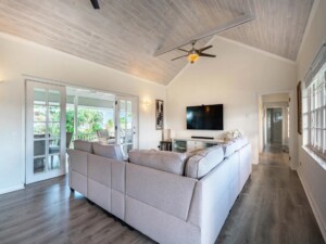 The home has been recently renovated, offering a fresh and comfortable space where everything flows easily on one level. The living and kitchen areas open directly onto a spacious patio and pool deck, making it simple to move between indoor comfort and outdoor living. Days naturally unfold by the infinity edge pool, whether you are enjoying a quiet morning swim or spending time with family and friends against a backdrop of uninterrupted sea views.